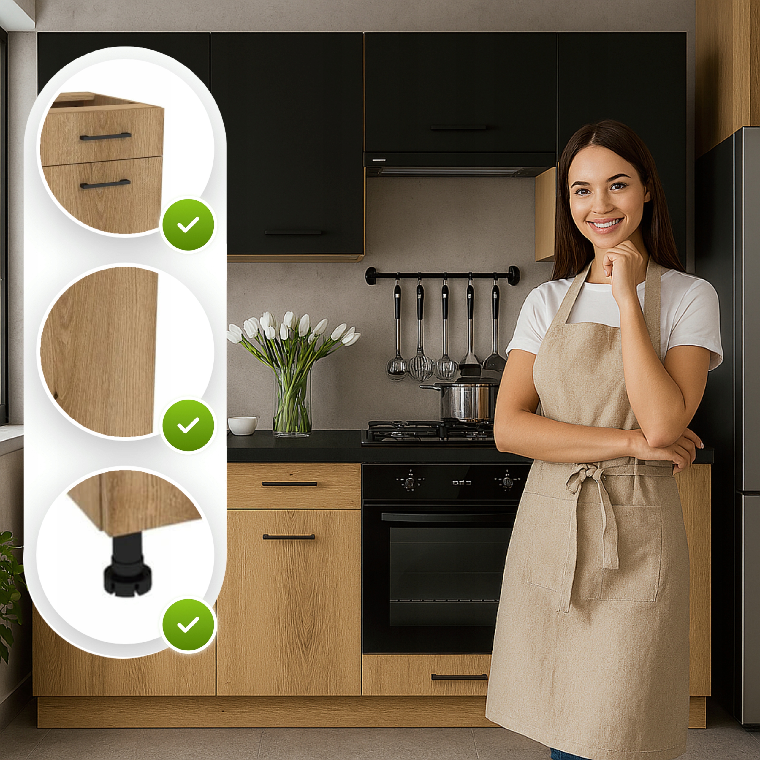 - Regulowane nóżki – dolne moduły posiadają nóżki z regulacją wysokości, które umożliwiają stabilne ustawienie mebli nawet na nierównym podłożu.