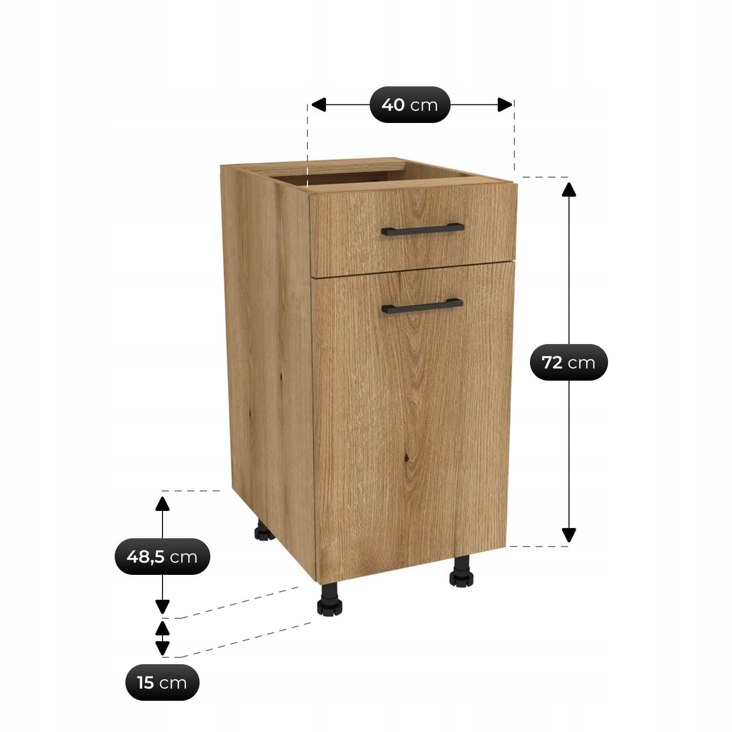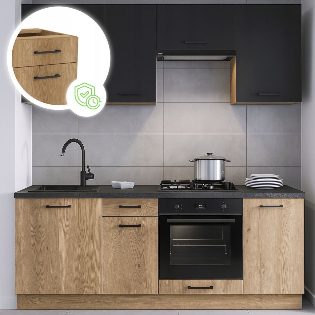 Przeglądając inne oferty zwróć uwagę na fronty, korpusy, zawiasy i prowadnice. Nasze zestawy zrobione są z płyty laminowanej (MDF lub wiórowa), która jest łatwa do czyszczenia, odporna na umiarkowaną wilgoć i zarysowania i tańsza niż lite drewno, ale wystarczająca na codzienne użytkowanie. W standardzie posiada też cichy domyk, co wydłuża żywotność mebli.