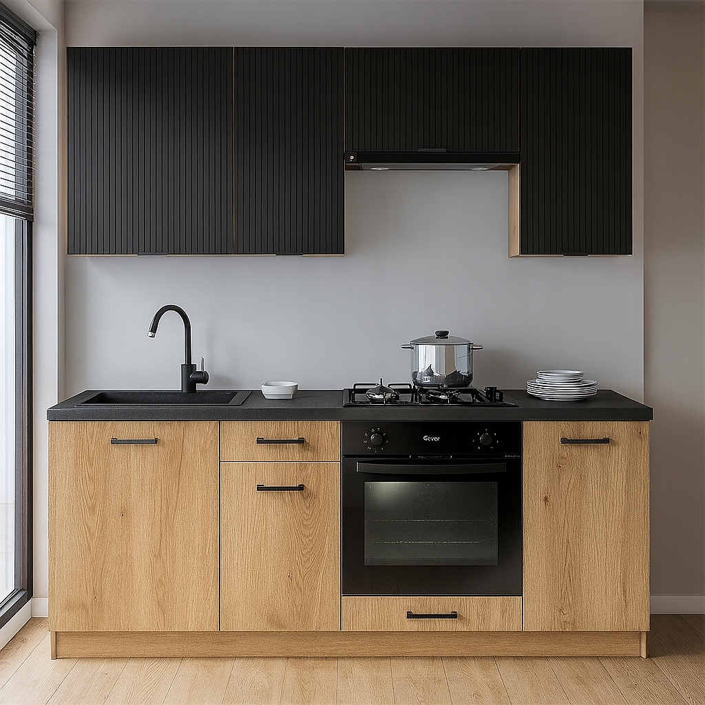 Kuchnia MODERN to nowoczesne i praktyczne rozwiązanie dla osób szukających funkcjonalnego zestawu kuchennego o kompaktowych wymiarach i estetycznym wyglądzie. Idealna dla tych, którzy chcą uniknąć długiego oczekiwania i skomplikowanego projektowania.