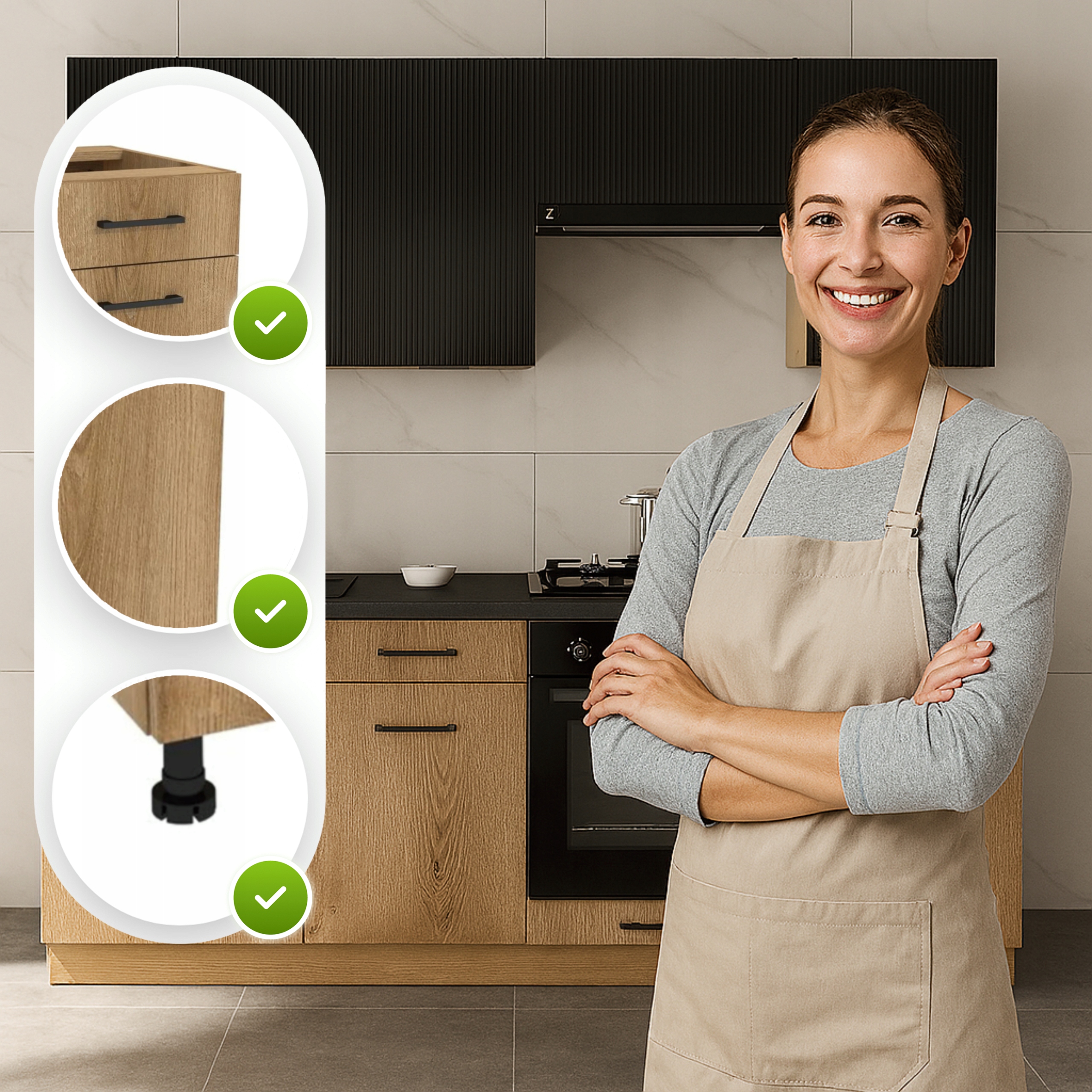 - Regulowane nóżki – dolne moduły posiadają nóżki z regulacją wysokości, które umożliwiają stabilne ustawienie mebli nawet na nierównym podłożu.