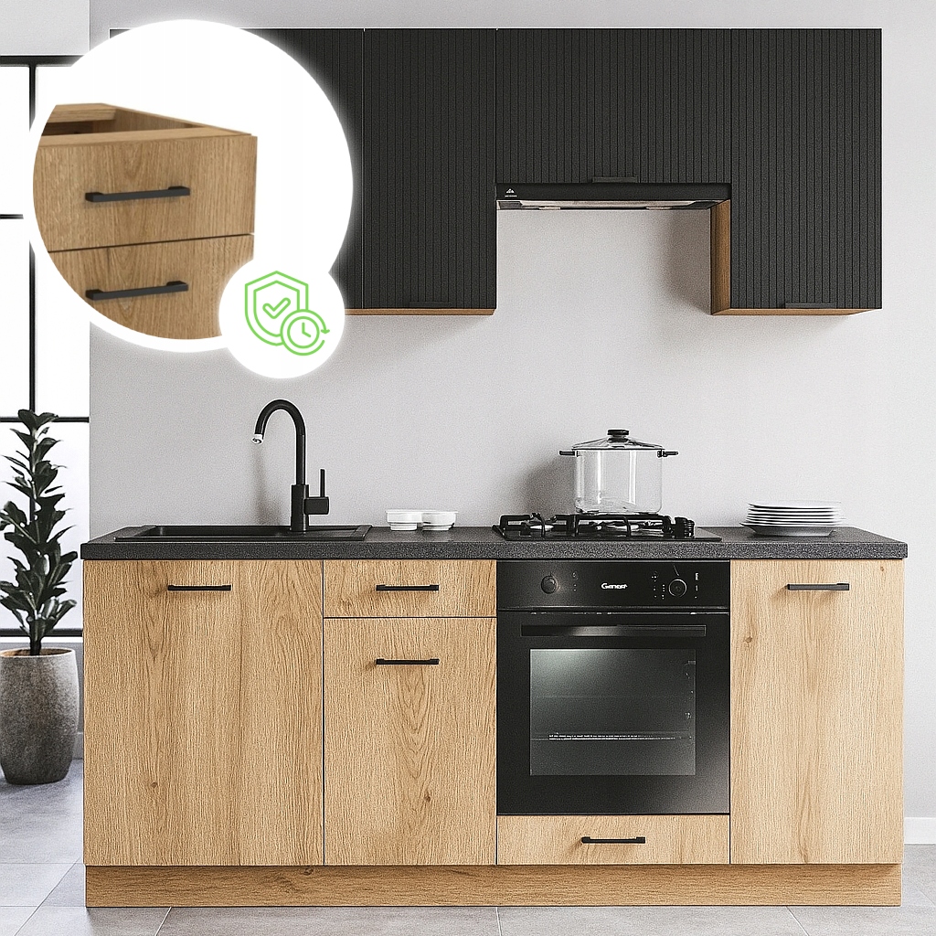 Przeglądając inne oferty zwróć uwagę na fronty, korpusy, zawiasy i prowadnice. Nasze zestawy zrobione są z płyty laminowanej (MDF lub wiórowa), która jest łatwa do czyszczenia, odporna na umiarkowaną wilgoć i zarysowania i tańsza niż lite drewno, ale wystarczająca na codzienne użytkowanie. W standardzie posiada też cichy domyk, co wydłuża żywotność mebli.