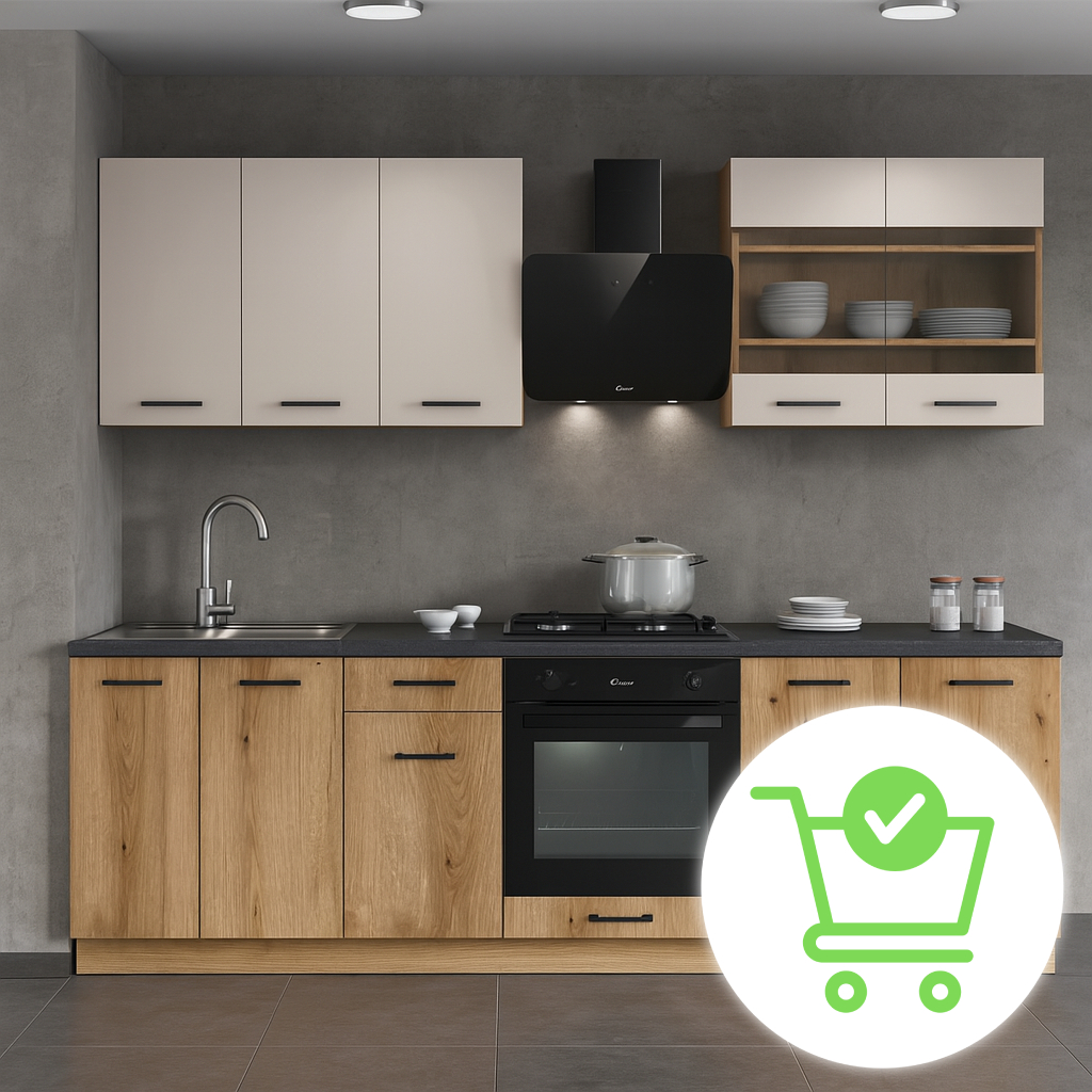 Kuchnia MODERN to nowoczesne i praktyczne rozwiązanie dla osób szukających funkcjonalnego zestawu kuchennego o kompaktowych wymiarach i estetycznym wyglądzie. Idealna dla tych, którzy chcą uniknąć długiego oczekiwania i skomplikowanego projektowania.