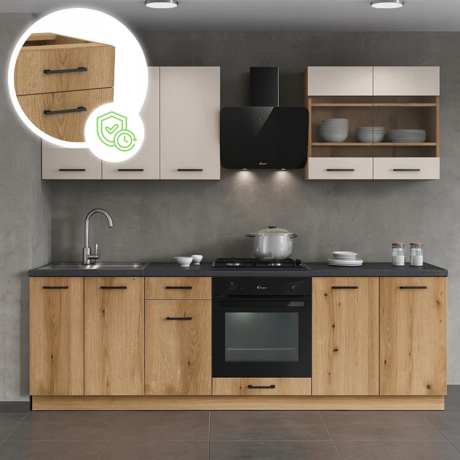 Kompaktowy wymiar – 260 cm szerokości idealny do małych kuchni, aneksów i mieszkań, w których liczy się każdy centymetr przestrzeni.