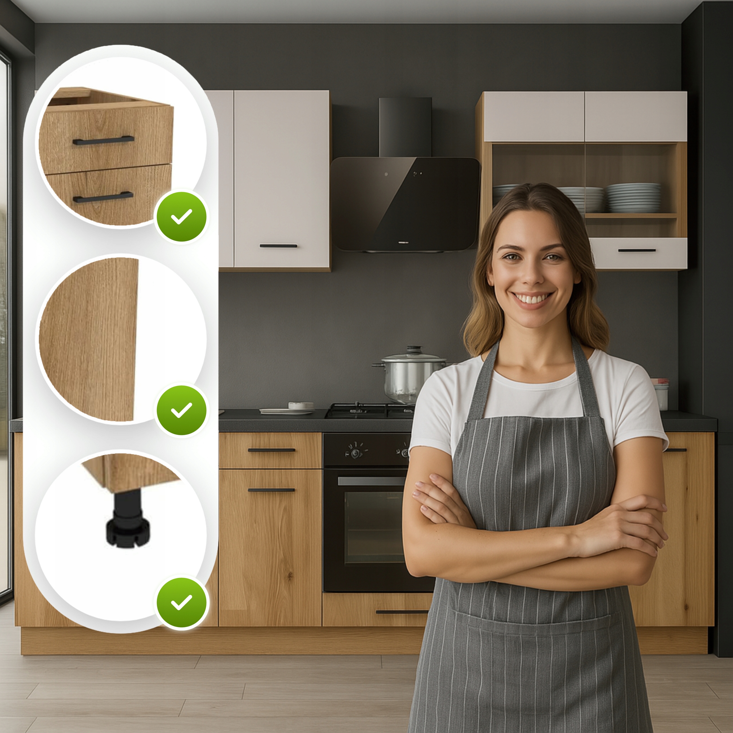 - Regulowane nóżki – dolne moduły posiadają nóżki z regulacją wysokości, które umożliwiają stabilne ustawienie mebli nawet na nierównym podłożu.