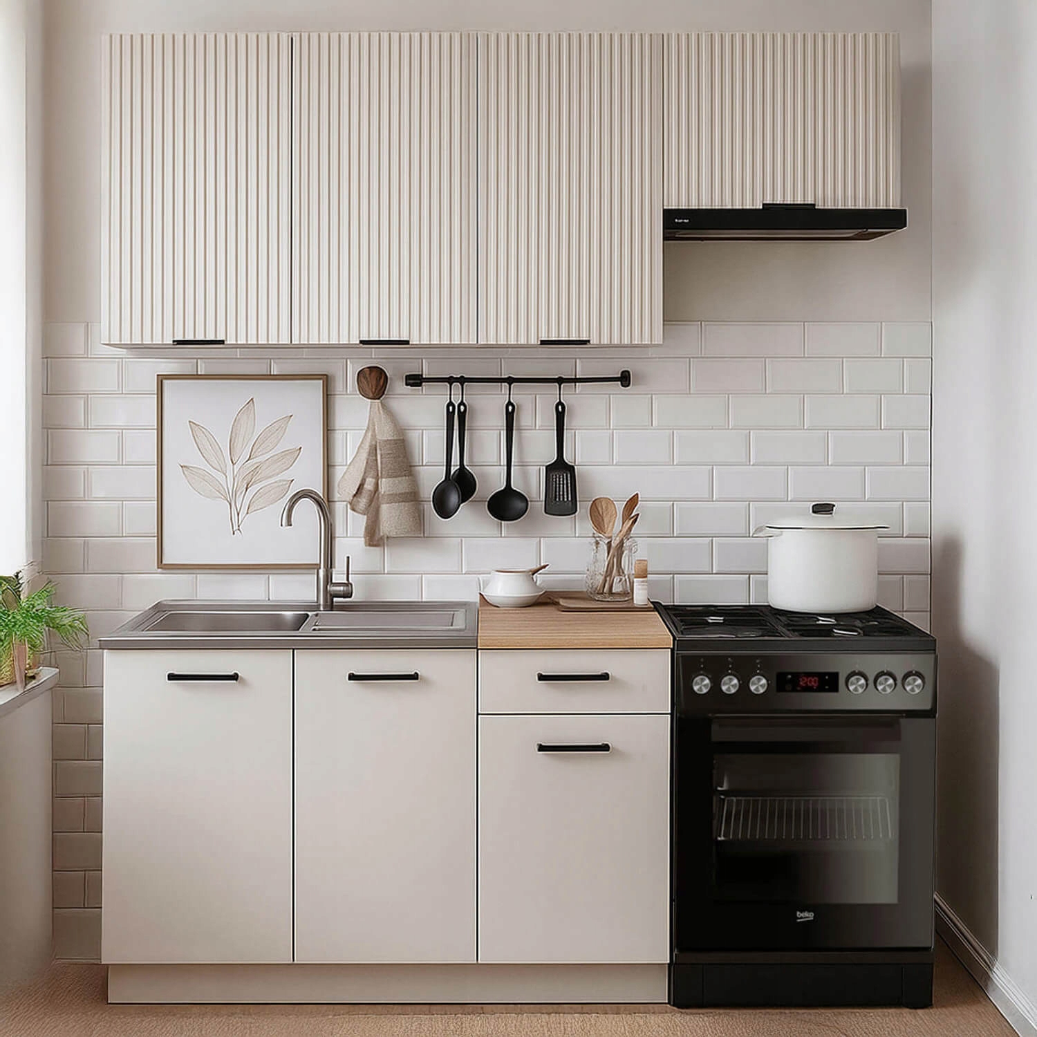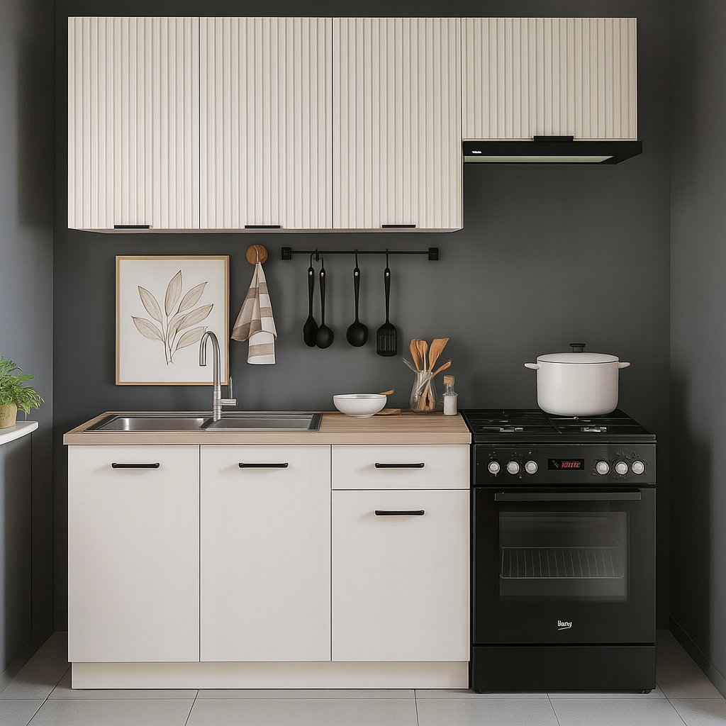 Kuchnia MODERN to nowoczesne i praktyczne rozwiązanie dla osób szukających funkcjonalnego zestawu kuchennego o kompaktowych wymiarach i estetycznym wyglądzie. Idealna dla tych, którzy chcą uniknąć długiego oczekiwania i skomplikowanego projektowania.