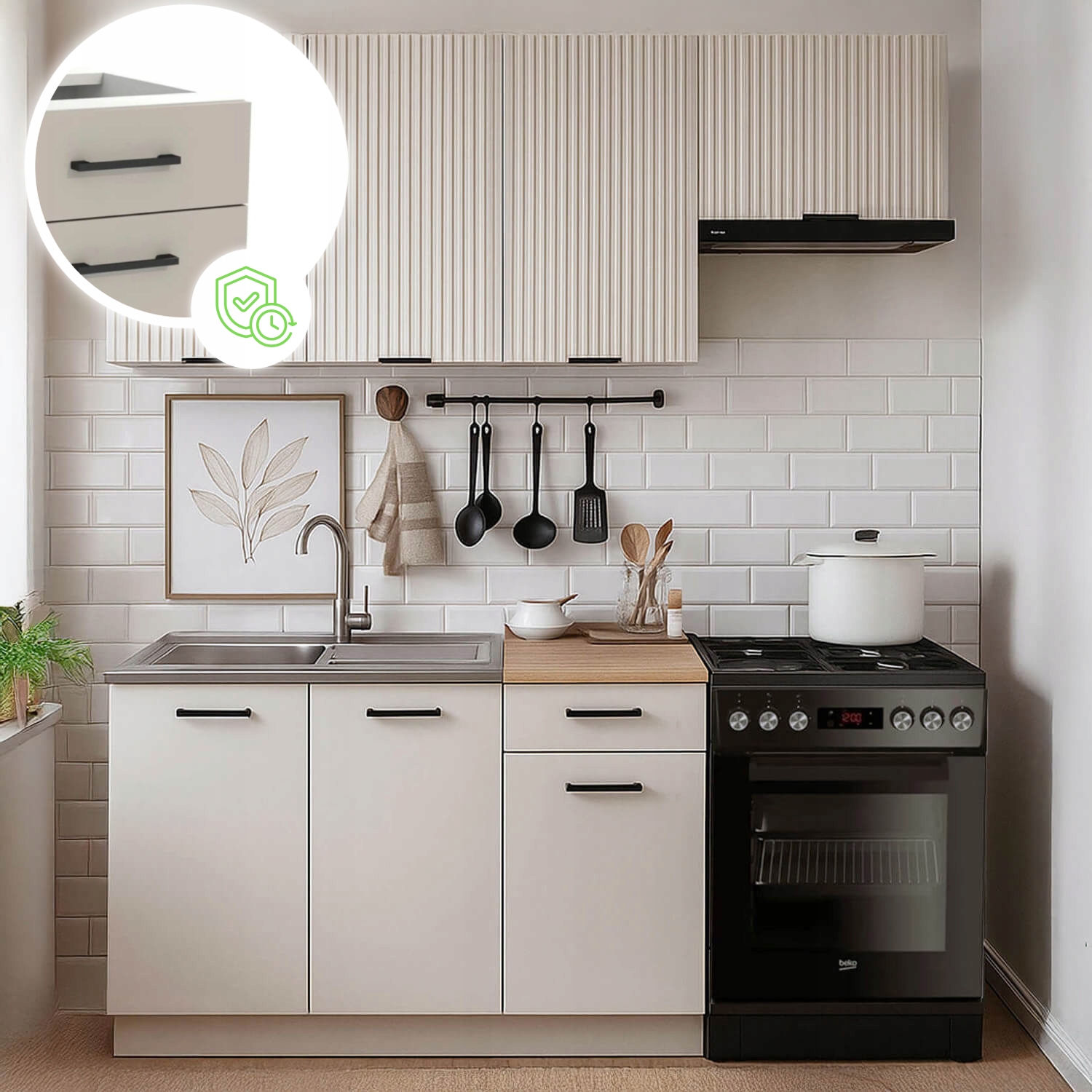Przeglądając inne oferty zwróć uwagę na fronty, korpusy, zawiasy i prowadnice. Nasze zestawy zrobione są z płyty laminowanej (MDF lub wiórowa), która jest łatwa do czyszczenia, odporna na umiarkowaną wilgoć i zarysowania i tańsza niż lite drewno, ale wystarczająca na codzienne użytkowanie. W standardzie posiada też cichy domyk, co wydłuża żywotność mebli.