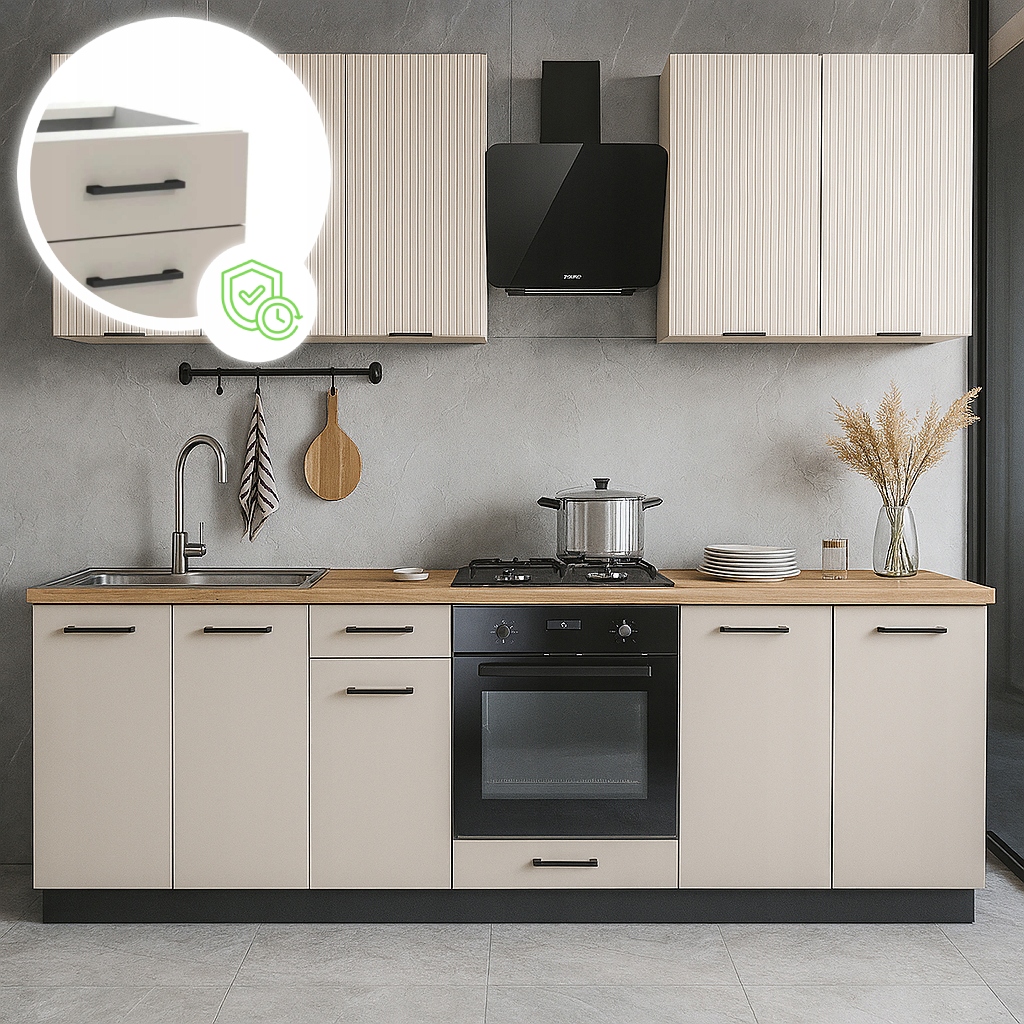Kompaktowy wymiar – 260 cm szerokości idealny do małych kuchni, aneksów i mieszkań, w których liczy się każdy centymetr przestrzeni.