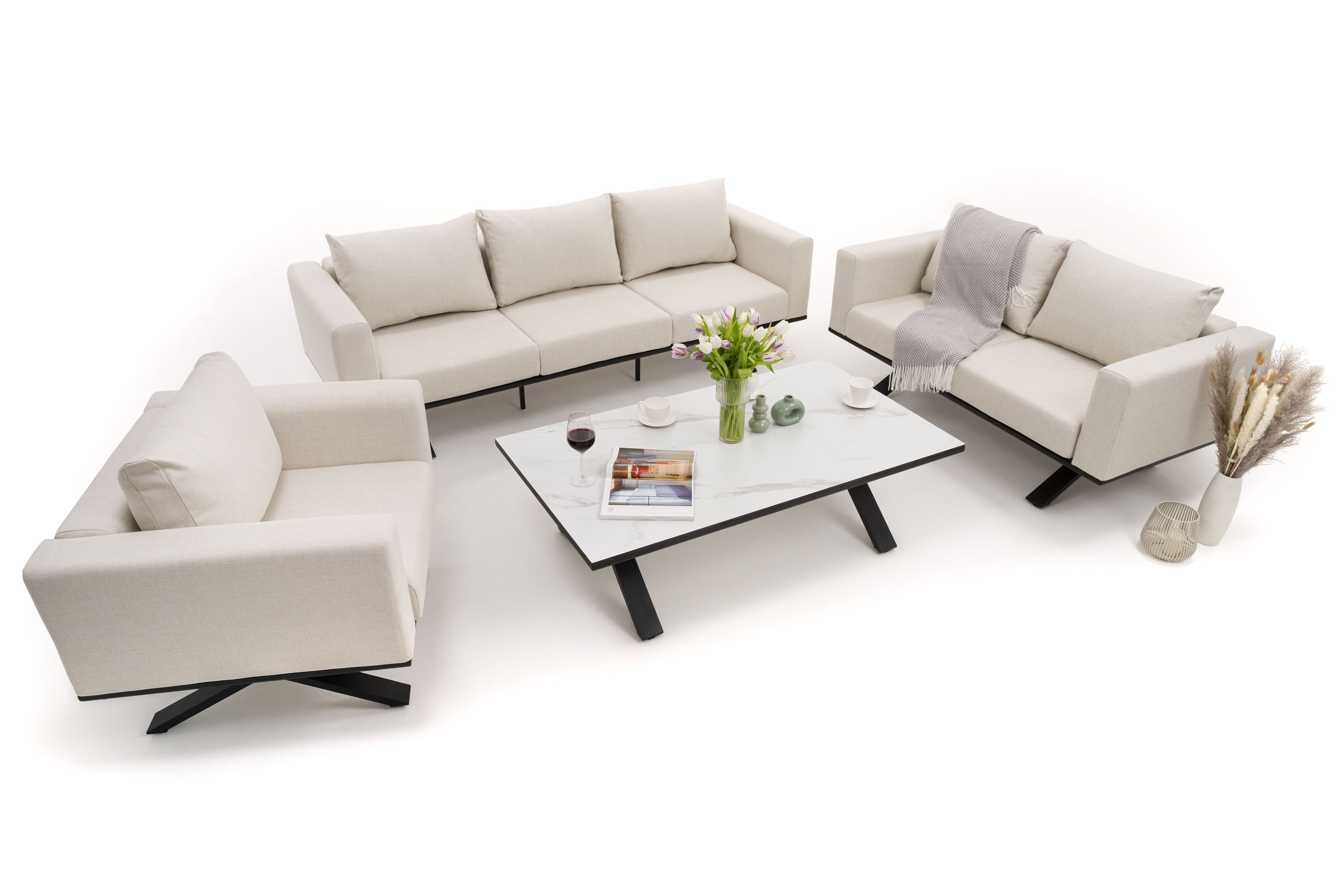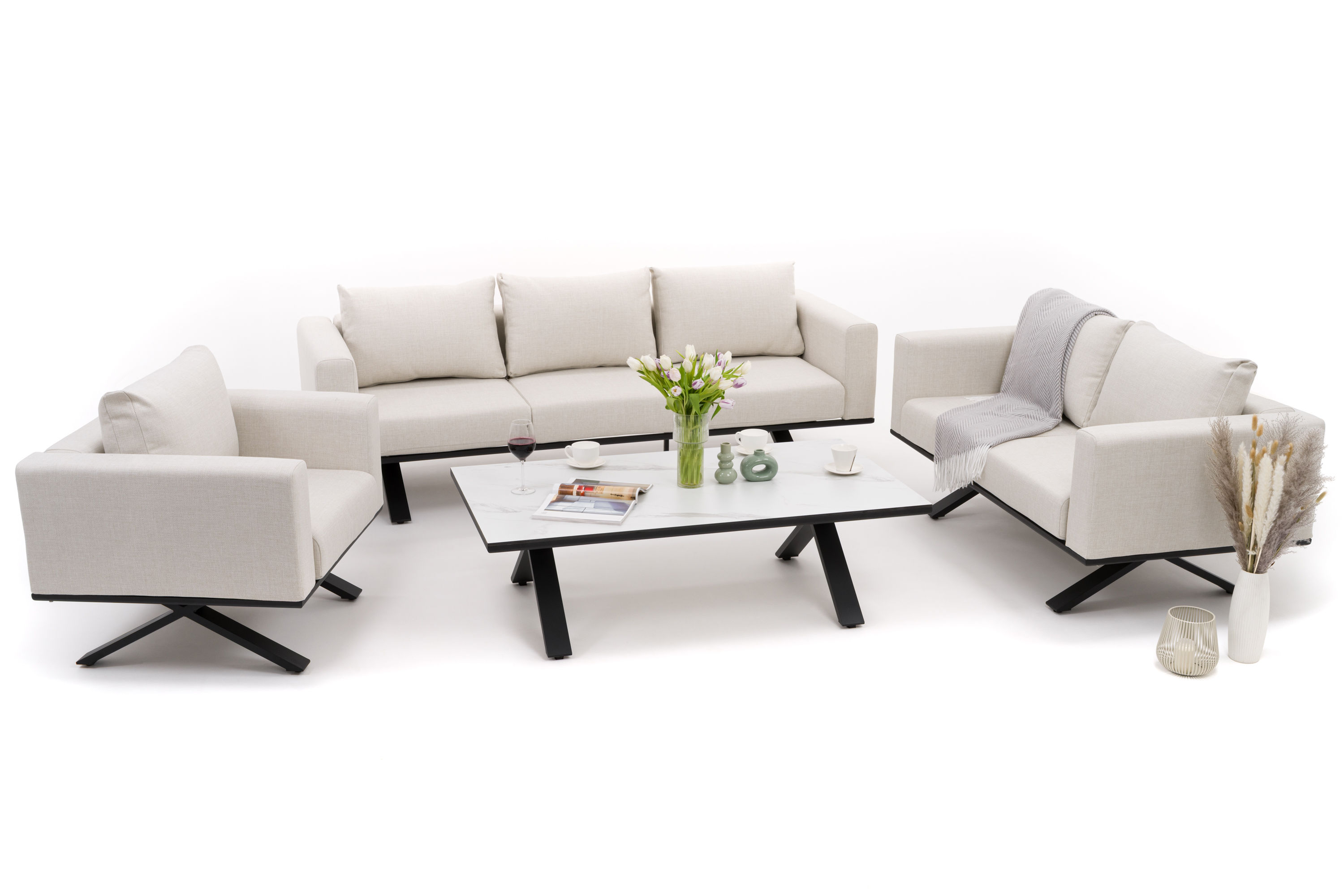 Do wyboru oferujemy kilka wariantów stołów z wyrafinowanymi blatami: od nowoczesnego czarnego marmuru z płyty HPL, przez ciepłe naturalne drewno tekowe, po elegancki biały kamień z płyty HPL. Każdy z nich osadzony jest na stabilnych, matowych nogach w industrialnym stylu, tworząc harmonijną całość z bryłą sof i foteli.