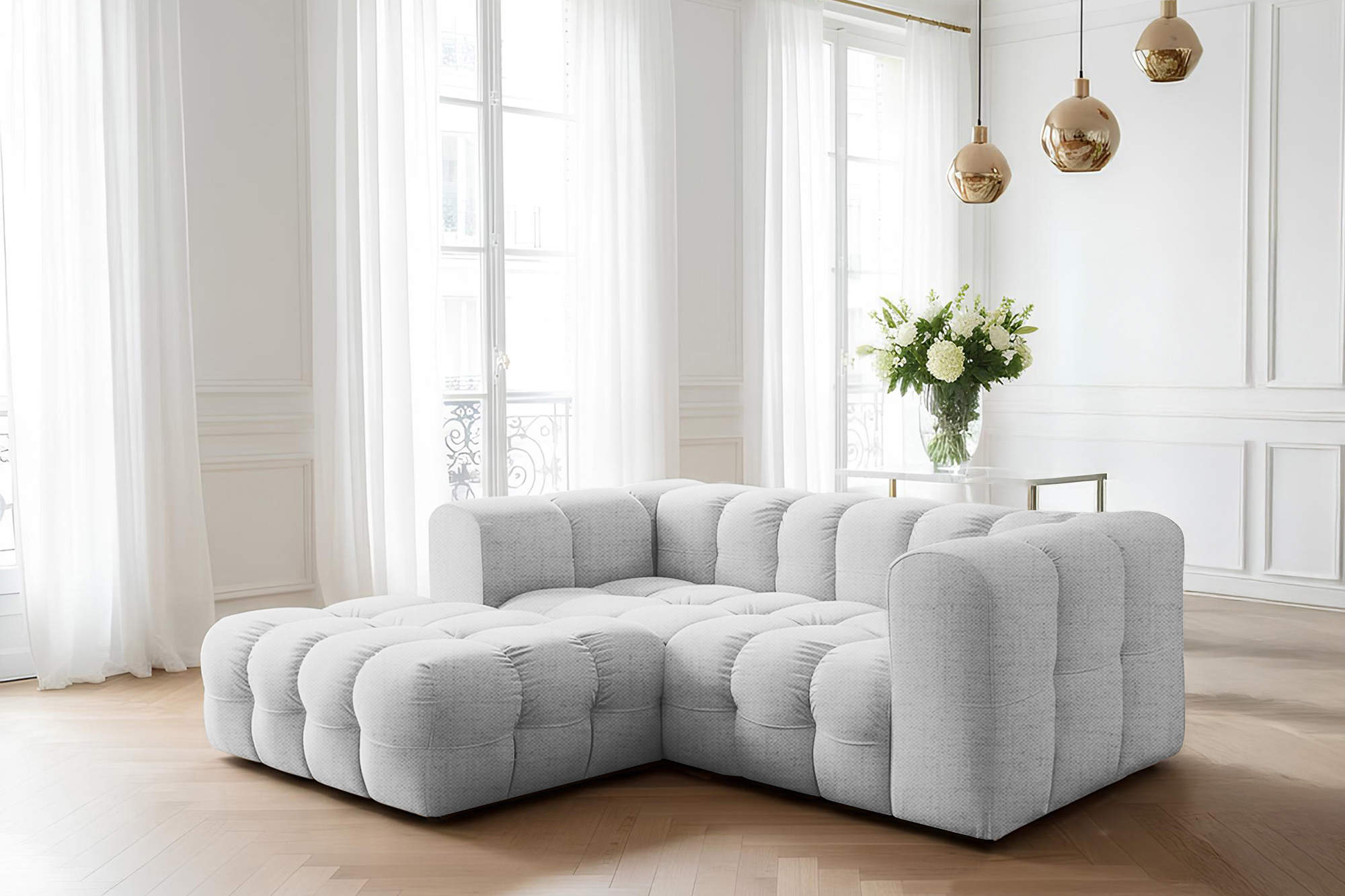 Narożnik Baloo L mini posiada głębokie siedzisko i otomanę, które zapraszają do zrelaksowania się w gronie rodziny i znajomych. Dzięki piance jest bardzo wygodny, a interesujący materiał zapewnia nowoczesny wygląd.