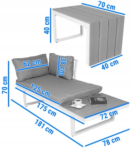 - Siedzisko: 125 x 72 x 9 cm /x 2 szt.