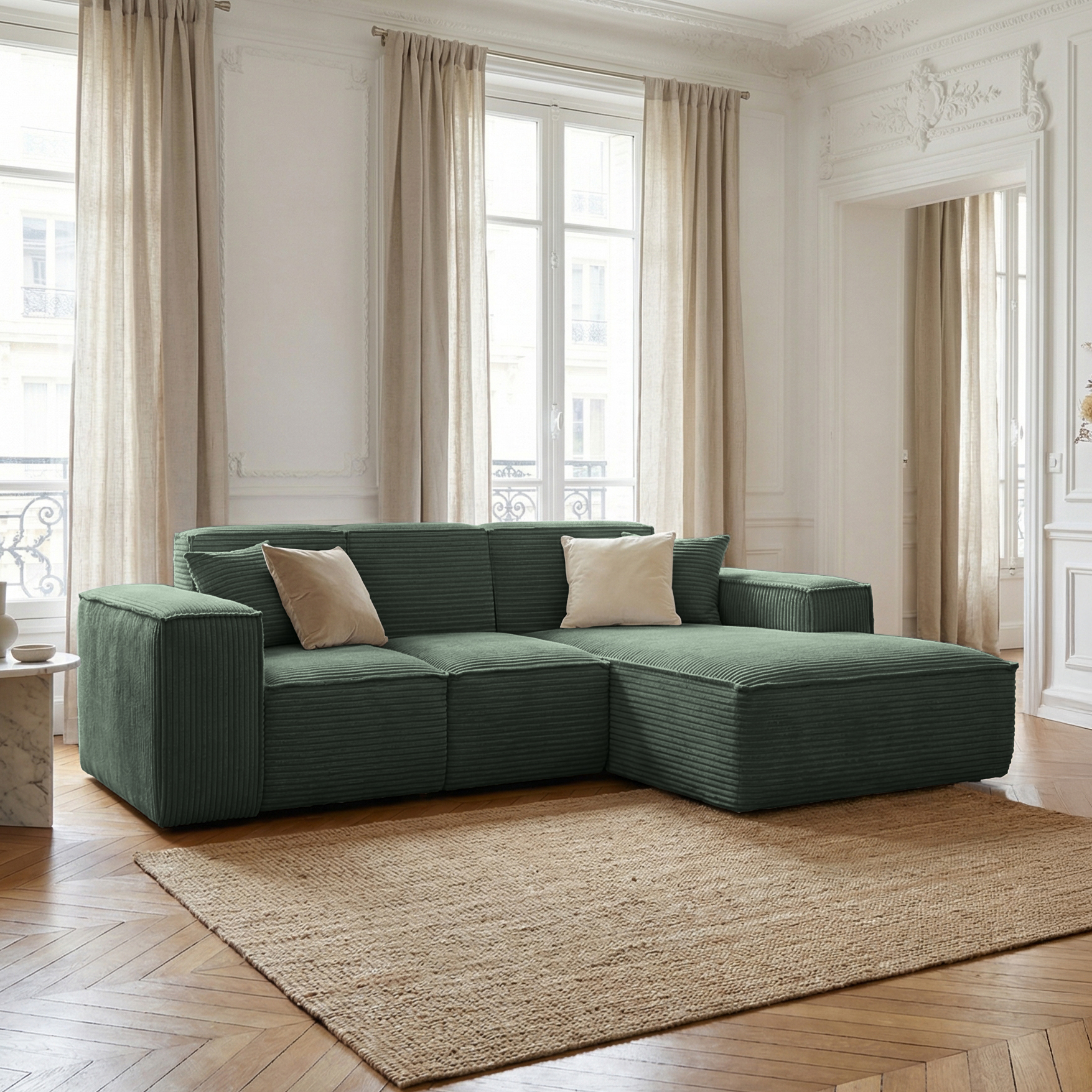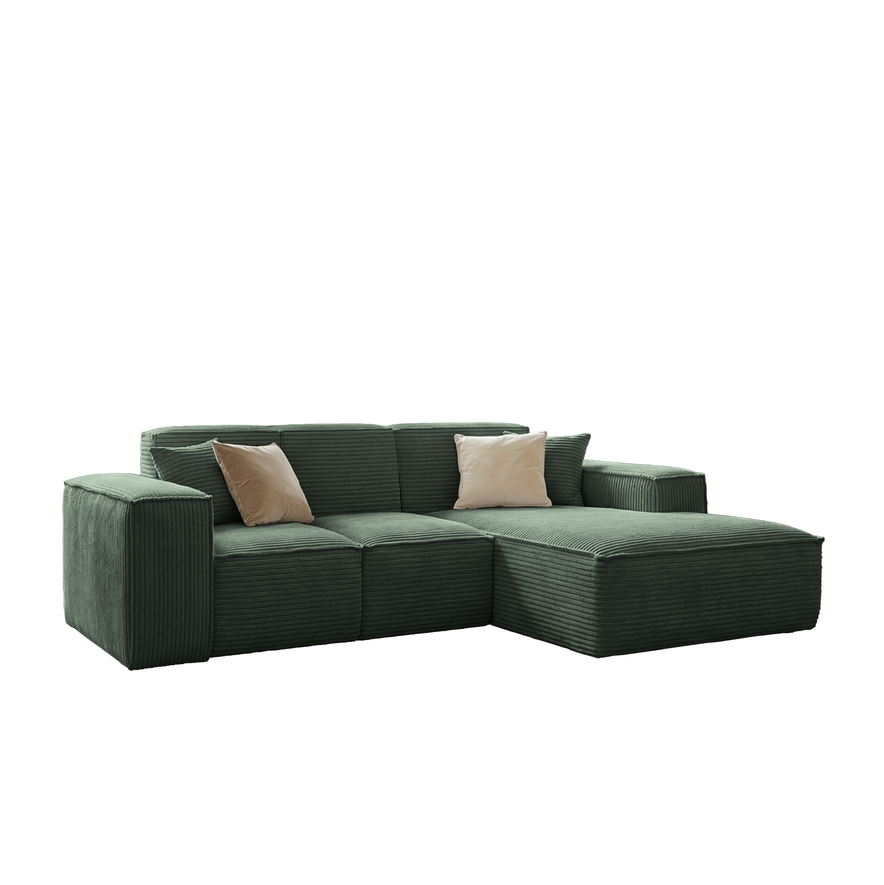 Narożnik SIENA to propozycja o nowoczesnej, minimalistycznej formie, wyróżniająca się szerokimi podłokietnikami i eleganckim, symetrycznym układem. Modułowa konstrukcja oraz przestronny szezlong zapewniają wyjątkowy komfort zarówno podczas siedzenia, jak i relaksu w pozycji leżącej. Głębokie, miękkie siedziska oraz dwie dekoracyjne poduszki zwiększają wygodę użytkowania. Narożnik osadzony jest bez widocznych nóżek, co nadaje mu solidny, masywny charakter i nowoczesny wygląd. Idealny do przestronnego salonu, tworzy stylowe i przytulne miejsce do wypoczynku.