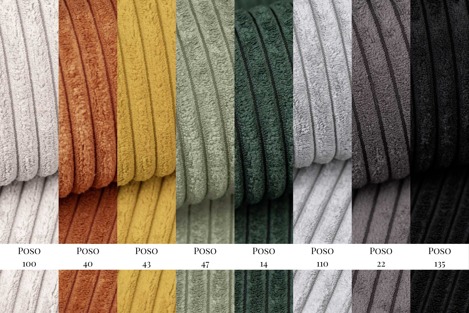 Welurowa tkanina obiciowa Poso to nowoczesna interpretacja klasycznego sztruksu. Jej charakterystyczne, głębokie rowki nadają tapicerowanym meblom wyjątkowo przytulny i domowy charakter, a nasycone pigmentami kolory dodatkowo podkreślają ich elegancję.