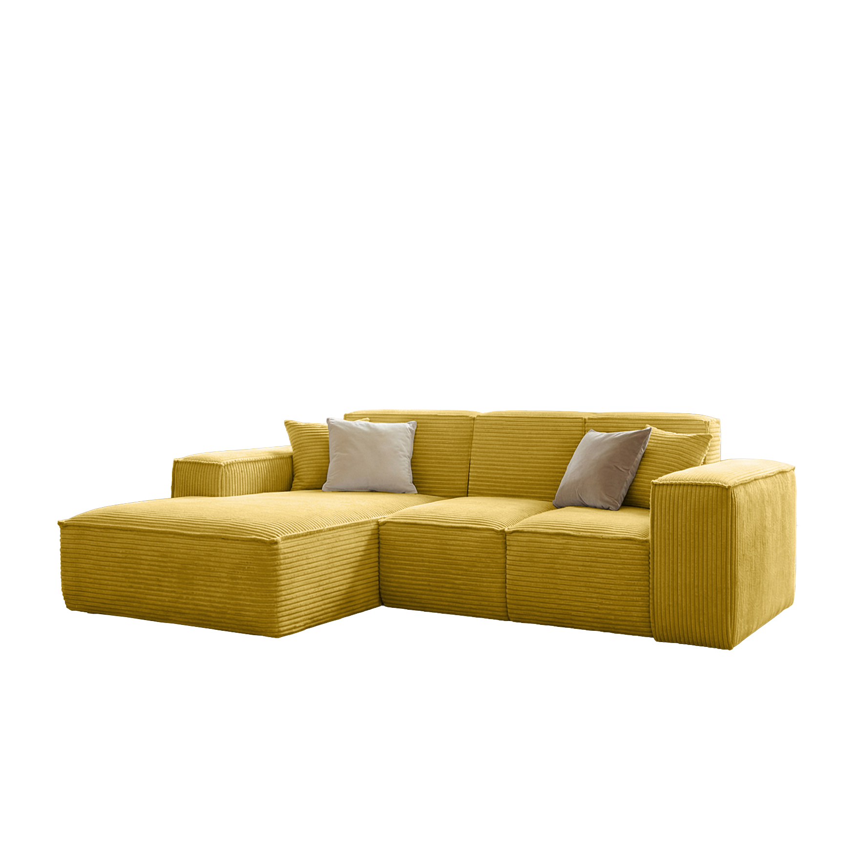 Narożnik SIENA to propozycja o nowoczesnej, minimalistycznej formie, wyróżniająca się szerokimi podłokietnikami i eleganckim, symetrycznym układem. Modułowa konstrukcja oraz przestronny szezlong zapewniają wyjątkowy komfort zarówno podczas siedzenia, jak i relaksu w pozycji leżącej. Głębokie, miękkie siedziska oraz dwie dekoracyjne poduszki zwiększają wygodę użytkowania. Narożnik osadzony jest bez widocznych nóżek, co nadaje mu solidny, masywny charakter i nowoczesny wygląd. Idealny do przestronnego salonu, tworzy stylowe i przytulne miejsce do wypoczynku.