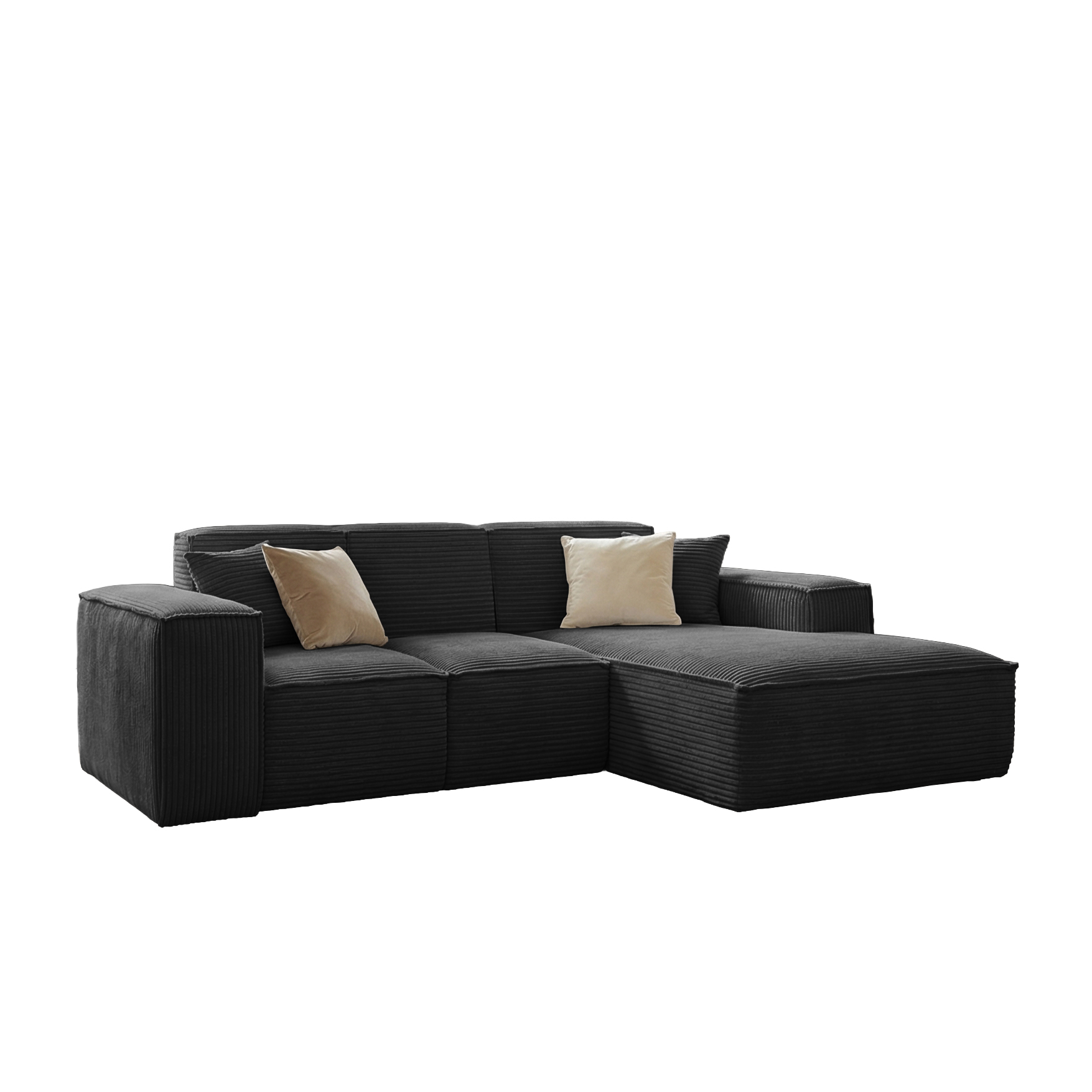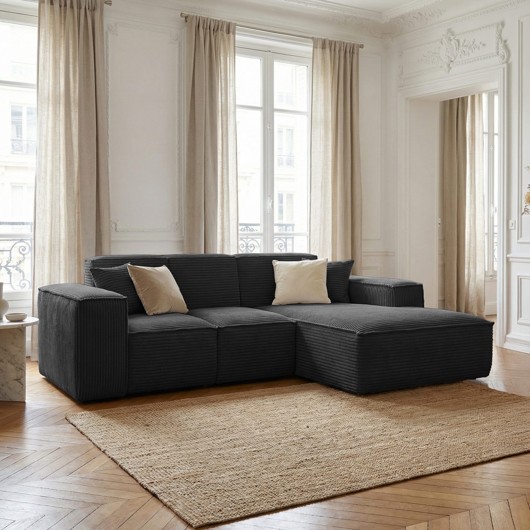 Narożnik SIENA to propozycja o nowoczesnej, minimalistycznej formie, wyróżniająca się szerokimi podłokietnikami i eleganckim, symetrycznym układem. Modułowa konstrukcja oraz przestronny szezlong zapewniają wyjątkowy komfort zarówno podczas siedzenia, jak i relaksu w pozycji leżącej. Głębokie, miękkie siedziska oraz dwie dekoracyjne poduszki zwiększają wygodę użytkowania. Narożnik osadzony jest bez widocznych nóżek, co nadaje mu solidny, masywny charakter i nowoczesny wygląd. Idealny do przestronnego salonu, tworzy stylowe i przytulne miejsce do wypoczynku.