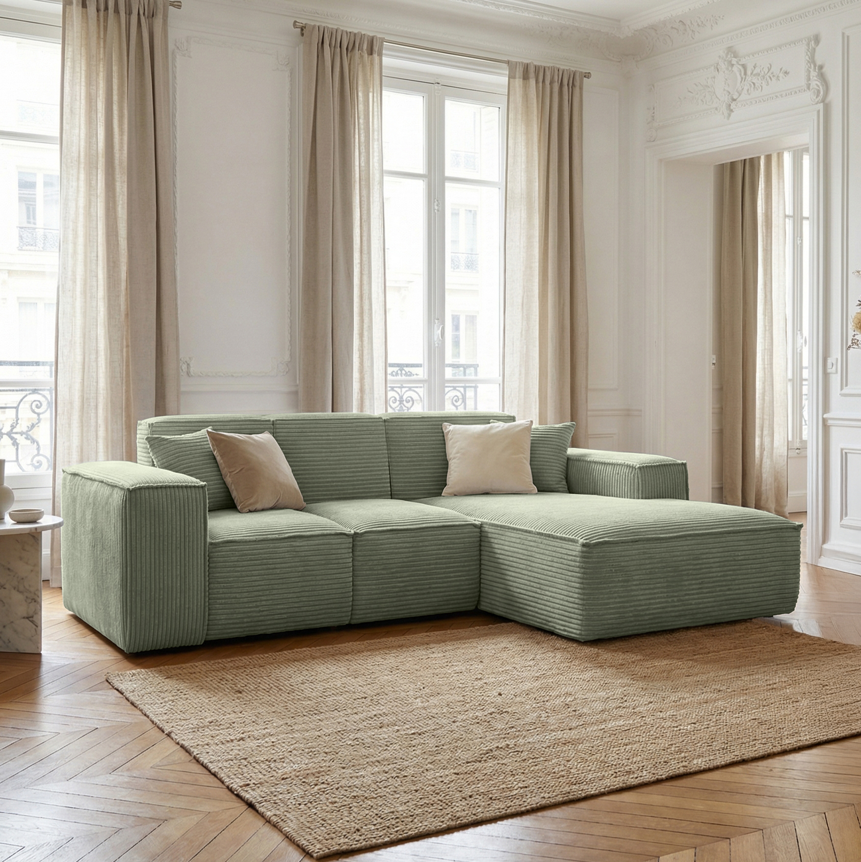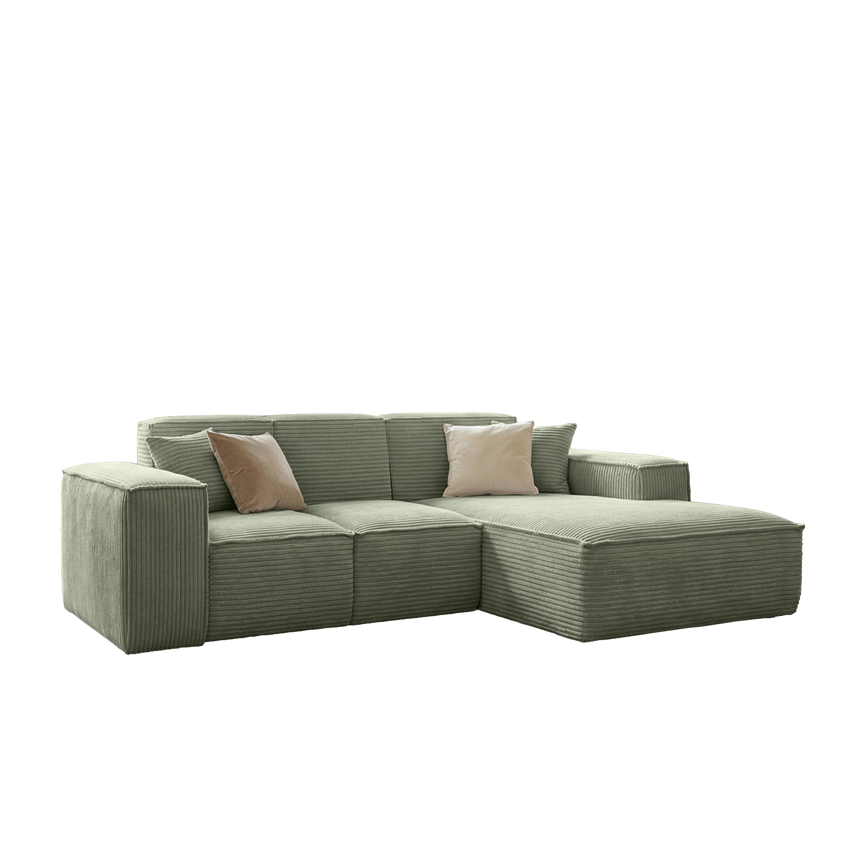Narożnik SIENA to propozycja o nowoczesnej, minimalistycznej formie, wyróżniająca się szerokimi podłokietnikami i eleganckim, symetrycznym układem. Modułowa konstrukcja oraz przestronny szezlong zapewniają wyjątkowy komfort zarówno podczas siedzenia, jak i relaksu w pozycji leżącej. Głębokie, miękkie siedziska oraz dwie dekoracyjne poduszki zwiększają wygodę użytkowania. Narożnik osadzony jest bez widocznych nóżek, co nadaje mu solidny, masywny charakter i nowoczesny wygląd. Idealny do przestronnego salonu, tworzy stylowe i przytulne miejsce do wypoczynku.