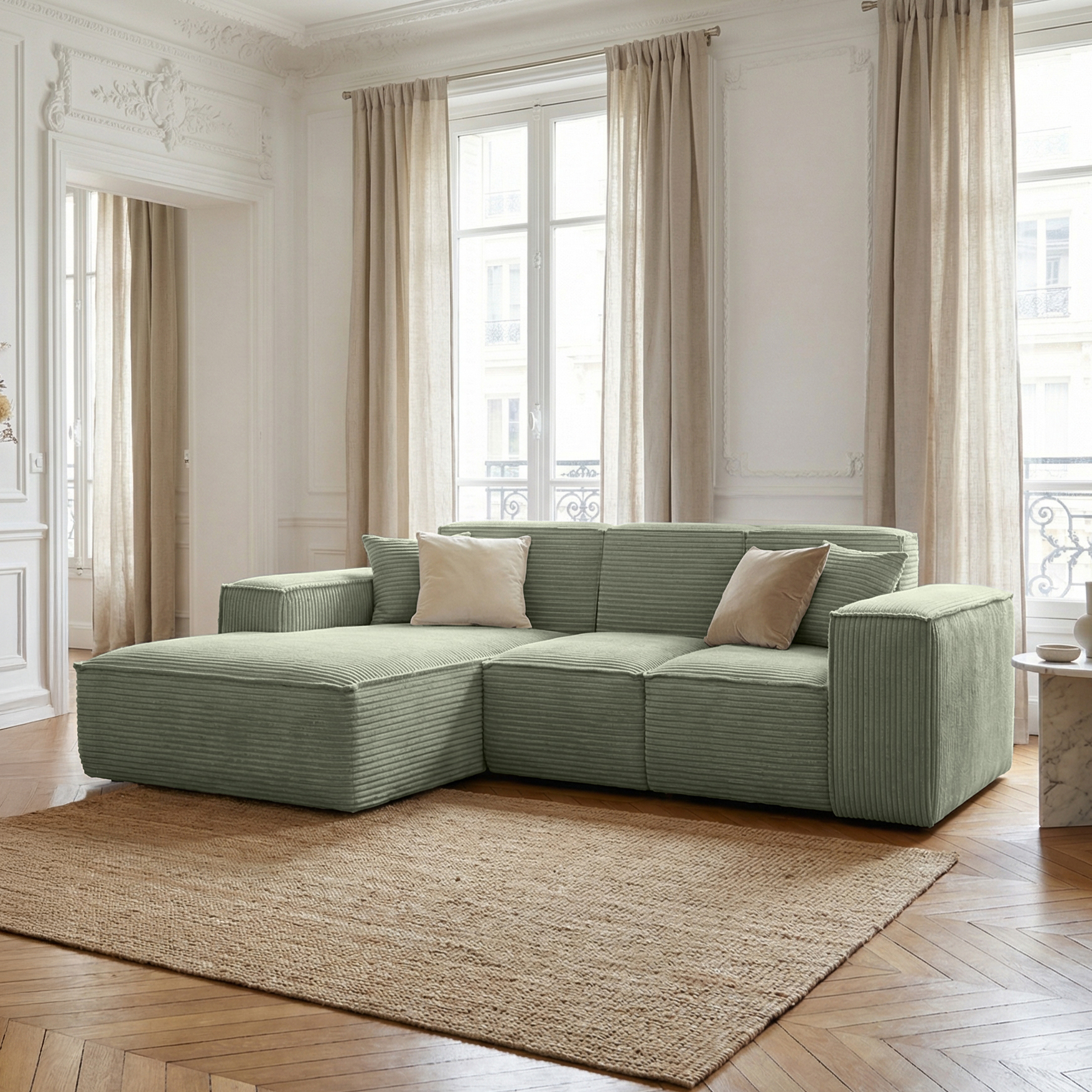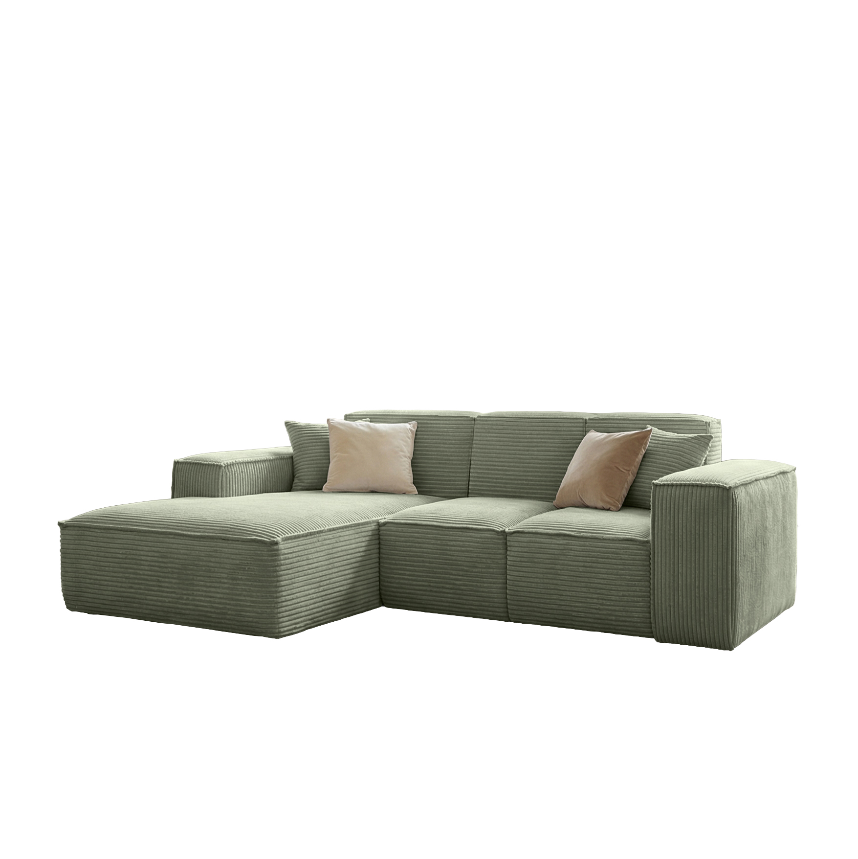 Narożnik SIENA to propozycja o nowoczesnej, minimalistycznej formie, wyróżniająca się szerokimi podłokietnikami i eleganckim, symetrycznym układem. Modułowa konstrukcja oraz przestronny szezlong zapewniają wyjątkowy komfort zarówno podczas siedzenia, jak i relaksu w pozycji leżącej. Głębokie, miękkie siedziska oraz dwie dekoracyjne poduszki zwiększają wygodę użytkowania. Narożnik osadzony jest bez widocznych nóżek, co nadaje mu solidny, masywny charakter i nowoczesny wygląd. Idealny do przestronnego salonu, tworzy stylowe i przytulne miejsce do wypoczynku.