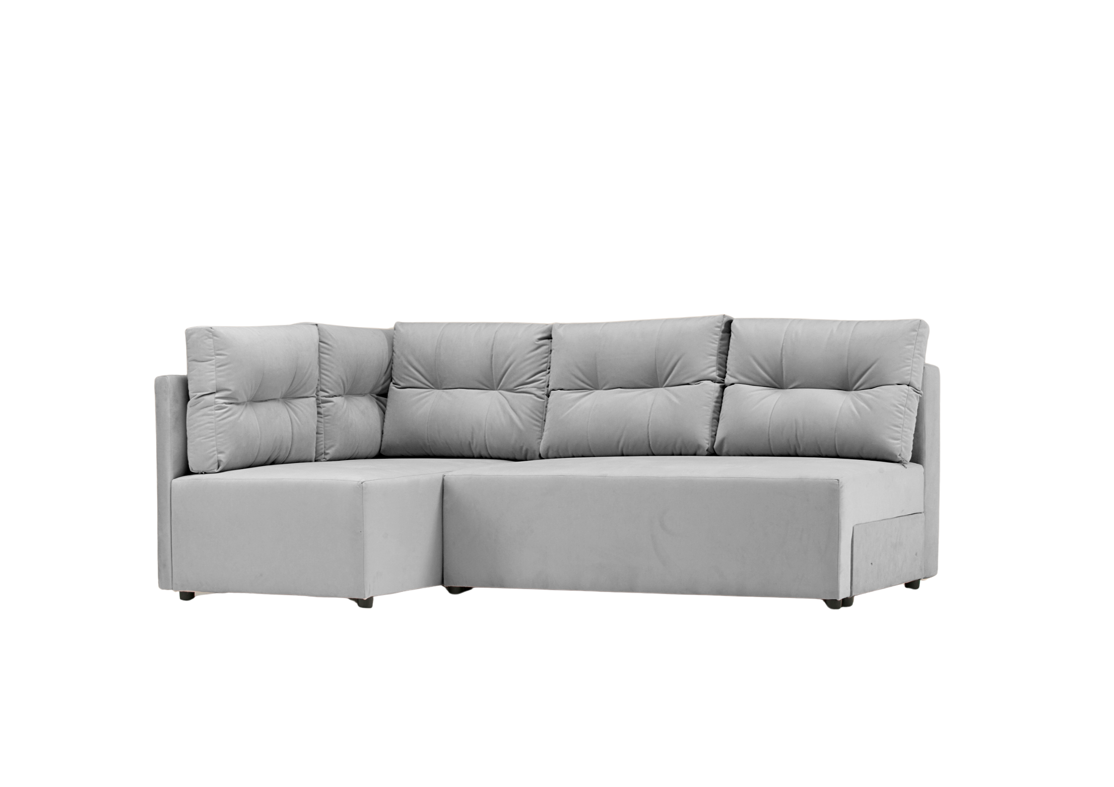 Kanapa narożna lewa produkowana w wymiarze 208x140cm jest meblem idealnym dla małych pomieszczeń. Rogówka rozkłada się do funkcji spania, posiada 1 pojemnik na pościel pod powierzchnią siedziskową. Narożnik wyposażyliśmy w 5 dużych pikowanych poduszek, które od strony ściany mają również podporę, by zapobiegać jej brudzeniu.