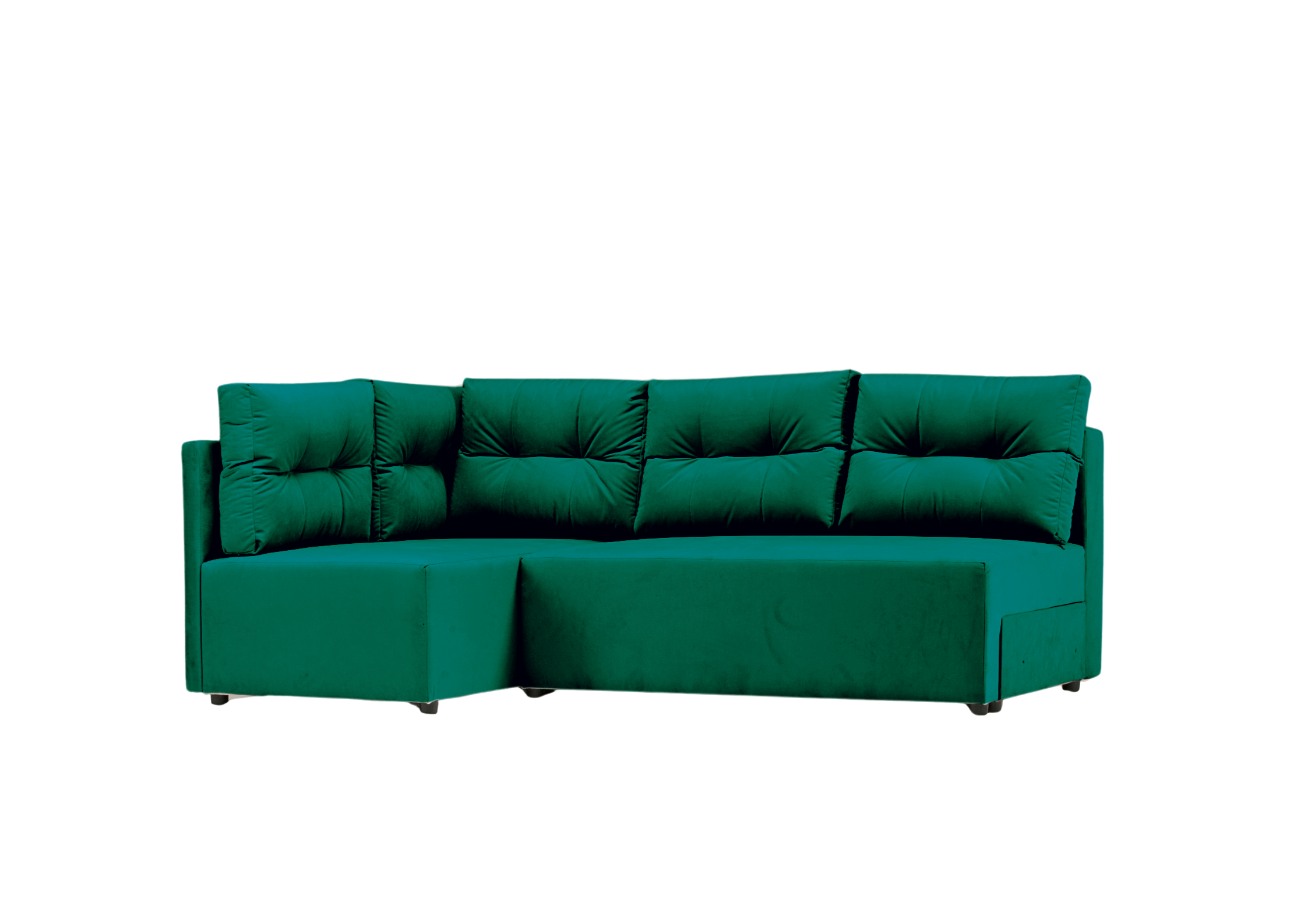 Kanapa narożna lewa produkowana w wymiarze 208x140cm jest meblem idealnym dla małych pomieszczeń. Rogówka rozkłada się do funkcji spania, posiada 1 pojemnik na pościel pod powierzchnią siedziskową. Narożnik wyposażyliśmy w 5 dużych pikowanych poduszek, które od strony ściany mają również podporę, by zapobiegać jej brudzeniu.