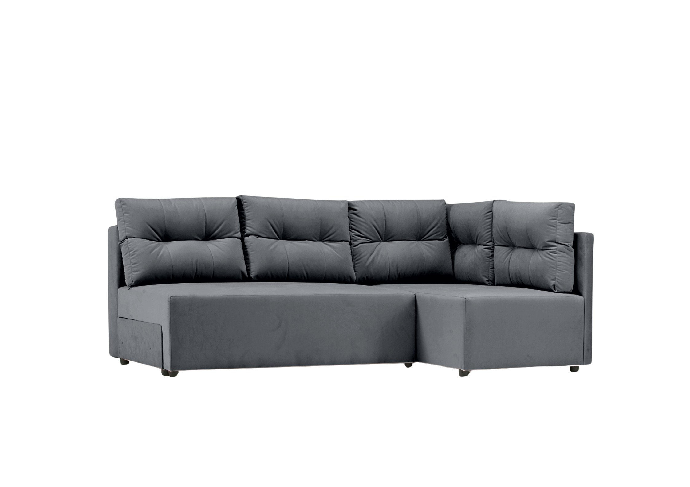 Kanapa narożna prawa produkowana w wymiarze 208x140cm jest meblem idealnym dla małych pomieszczeń. Rogówka rozkłada się do funkcji spania, posiada 1 pojemnik na pościel pod powierzchnią siedziskową. Narożnik wyposażyliśmy w 5 dużych pikowanych poduszek, które od strony ściany mają również podporę, by zapobiegać jej brudzeniu.