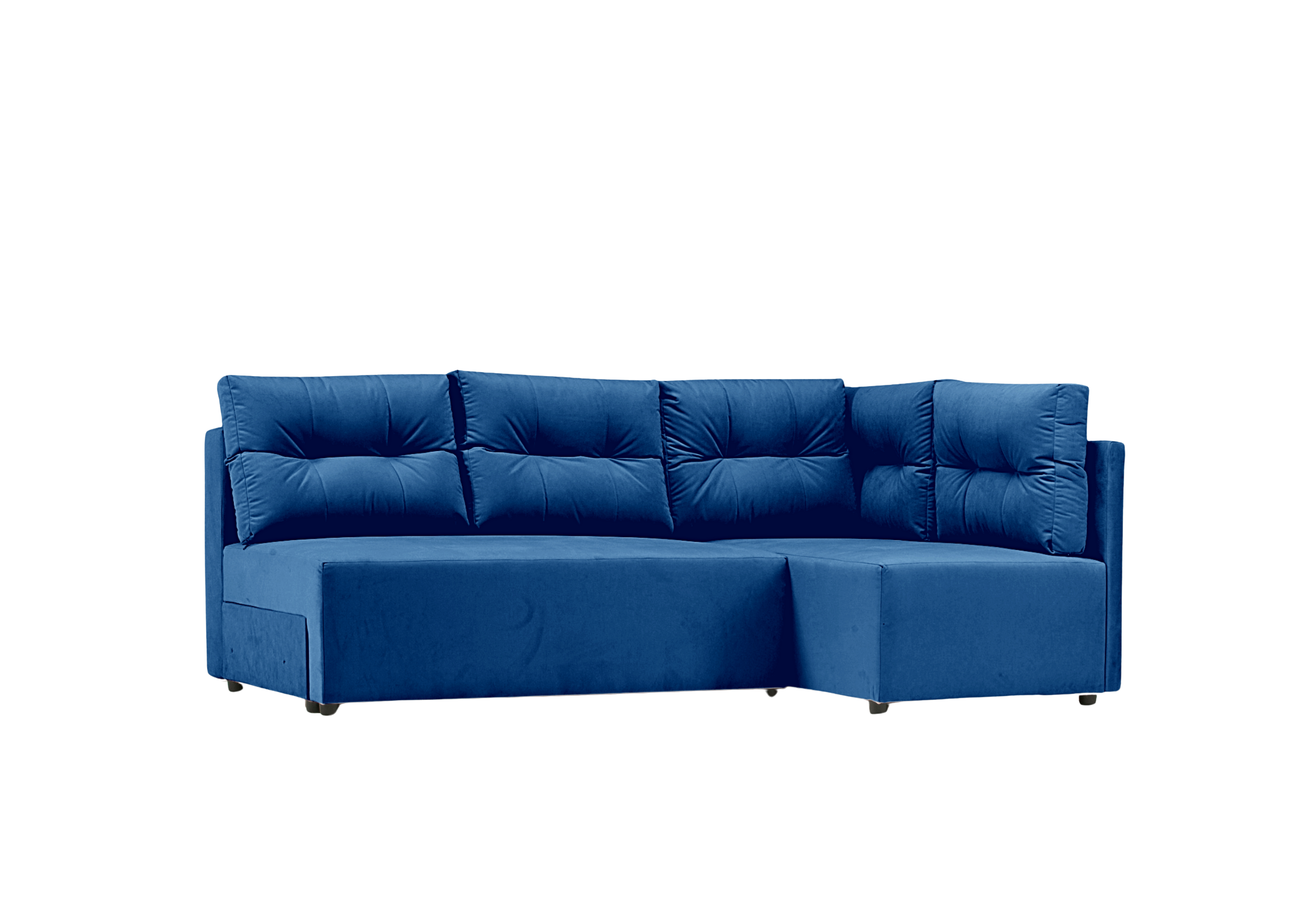 Kanapa narożna prawa produkowana w wymiarze 208x140cm jest meblem idealnym dla małych pomieszczeń. Rogówka rozkłada się do funkcji spania, posiada 1 pojemnik na pościel pod powierzchnią siedziskową. Narożnik wyposażyliśmy w 5 dużych pikowanych poduszek, które od strony ściany mają również podporę, by zapobiegać jej brudzeniu.