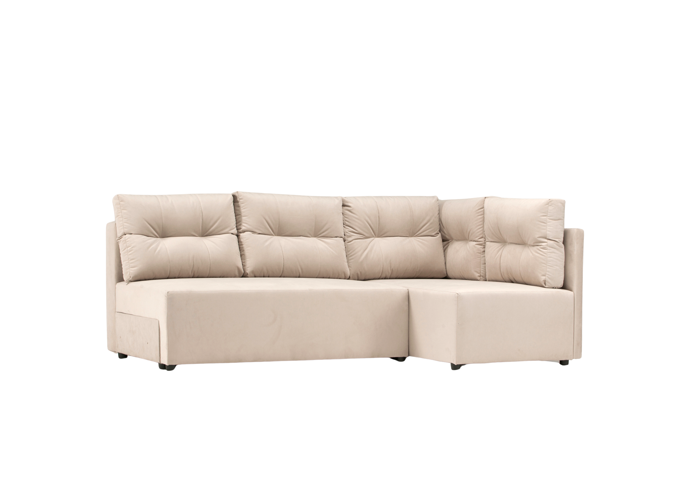 Kanapa narożna prawa produkowana w wymiarze 208x140cm jest meblem idealnym dla małych pomieszczeń. Rogówka rozkłada się do funkcji spania, posiada 1 pojemnik na pościel pod powierzchnią siedziskową. Narożnik wyposażyliśmy w 5 dużych pikowanych poduszek, które od strony ściany mają również podporę, by zapobiegać jej brudzeniu.