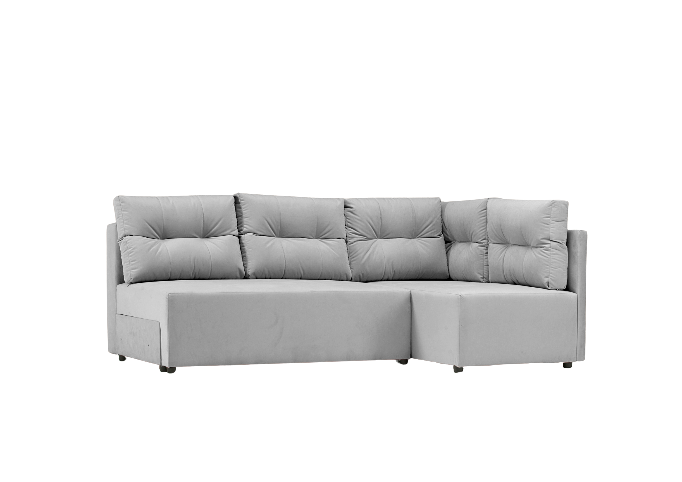 Kanapa narożna prawa produkowana w wymiarze 208x140cm jest meblem idealnym dla małych pomieszczeń. Rogówka rozkłada się do funkcji spania, posiada 1 pojemnik na pościel pod powierzchnią siedziskową. Narożnik wyposażyliśmy w 5 dużych pikowanych poduszek, które od strony ściany mają również podporę, by zapobiegać jej brudzeniu.