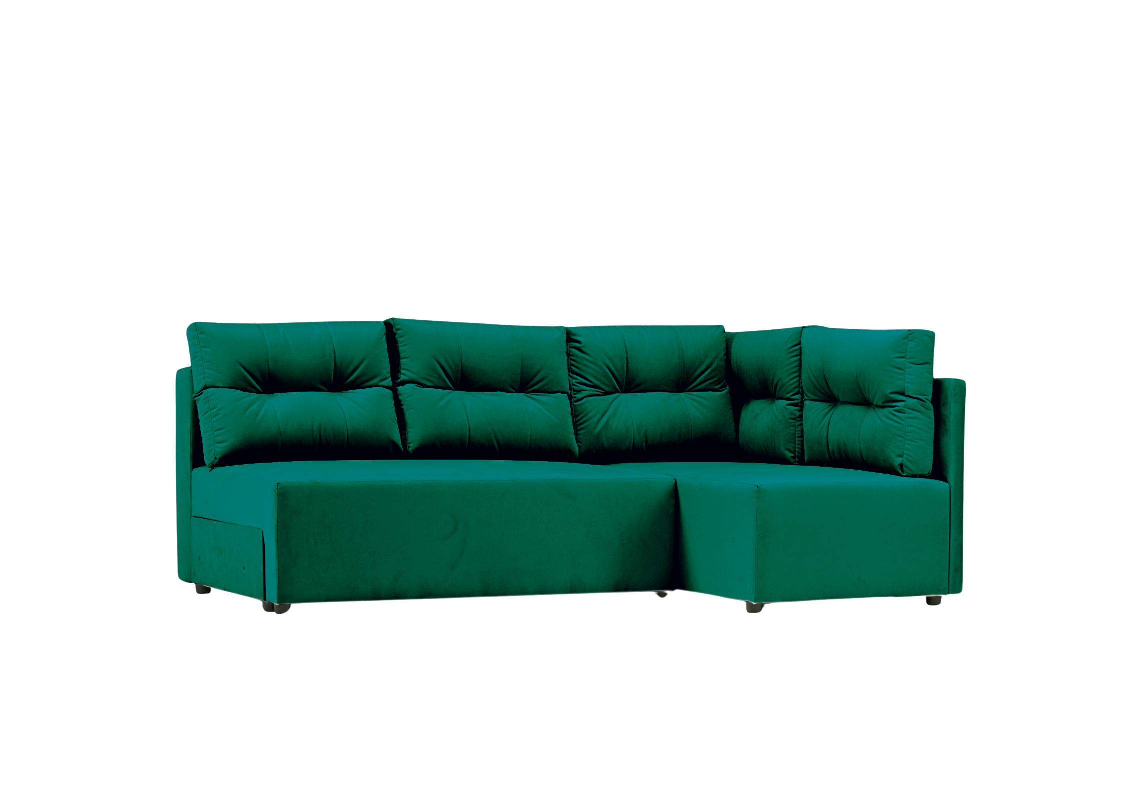 Kanapa narożna prawa produkowana w wymiarze 208x140cm jest meblem idealnym dla małych pomieszczeń. Rogówka rozkłada się do funkcji spania, posiada 1 pojemnik na pościel pod powierzchnią siedziskową. Narożnik wyposażyliśmy w 5 dużych pikowanych poduszek, które od strony ściany mają również podporę, by zapobiegać jej brudzeniu.