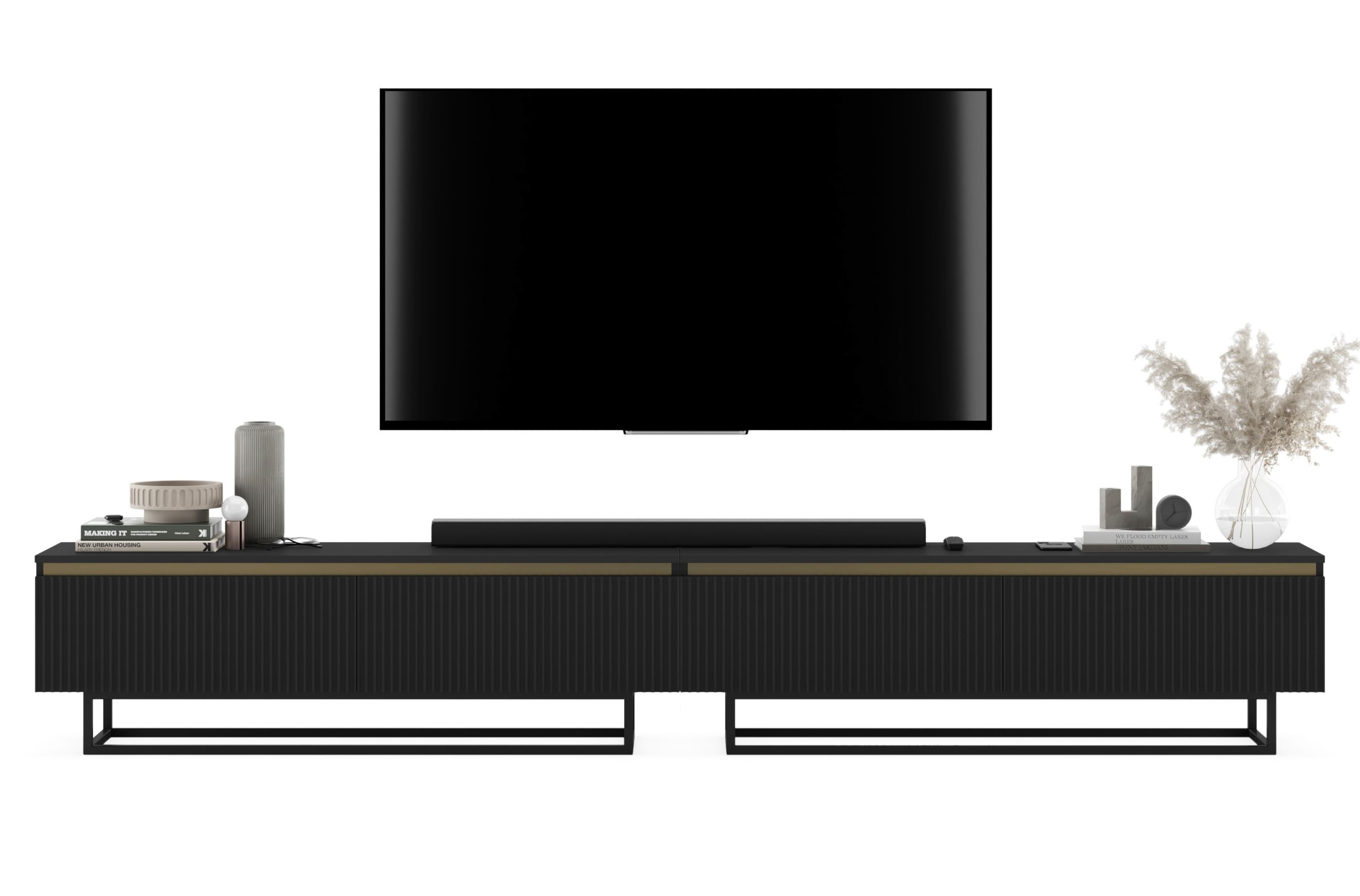 Zestaw dwóch nowoczesnych szafek RTV tworzących spójną i stylową całość. Razem oferują cztery przestronne, zamykane komory, zapewniając dużą pojemność oraz wysoką funkcjonalność. Szafki zostały ustawione obok siebie, tworząc długi, efektowny mebel, który doskonale prezentuje się w nowoczesnych wnętrzach. Całość osadzona jest na metalowych ramach, co nadaje konstrukcji lekkości i nowoczesnego charakteru, jednocześnie zapewniając stabilność i trwałość. Dzięki uchylnym drzwiczkom z blokadą opadania zapewniają łatwy i bezpieczny dostęp do wnętrza. System „push to open” eliminuje potrzebę stosowania uchwytów, podkreślając estetyczny i minimalistyczny charakter mebla. Charakterystyczne ryflowane fronty w połączeniu ze złotymi akcentami wyróżniają ten zestaw na tle innych szafek RTV, nadając mu luksusowego i nowoczesnego wyglądu. SELENE to idealny wybór dla osób ceniących elegancję, funkcjonalność oraz nowoczesne rozwiązania w aranżacji wnętrz.
