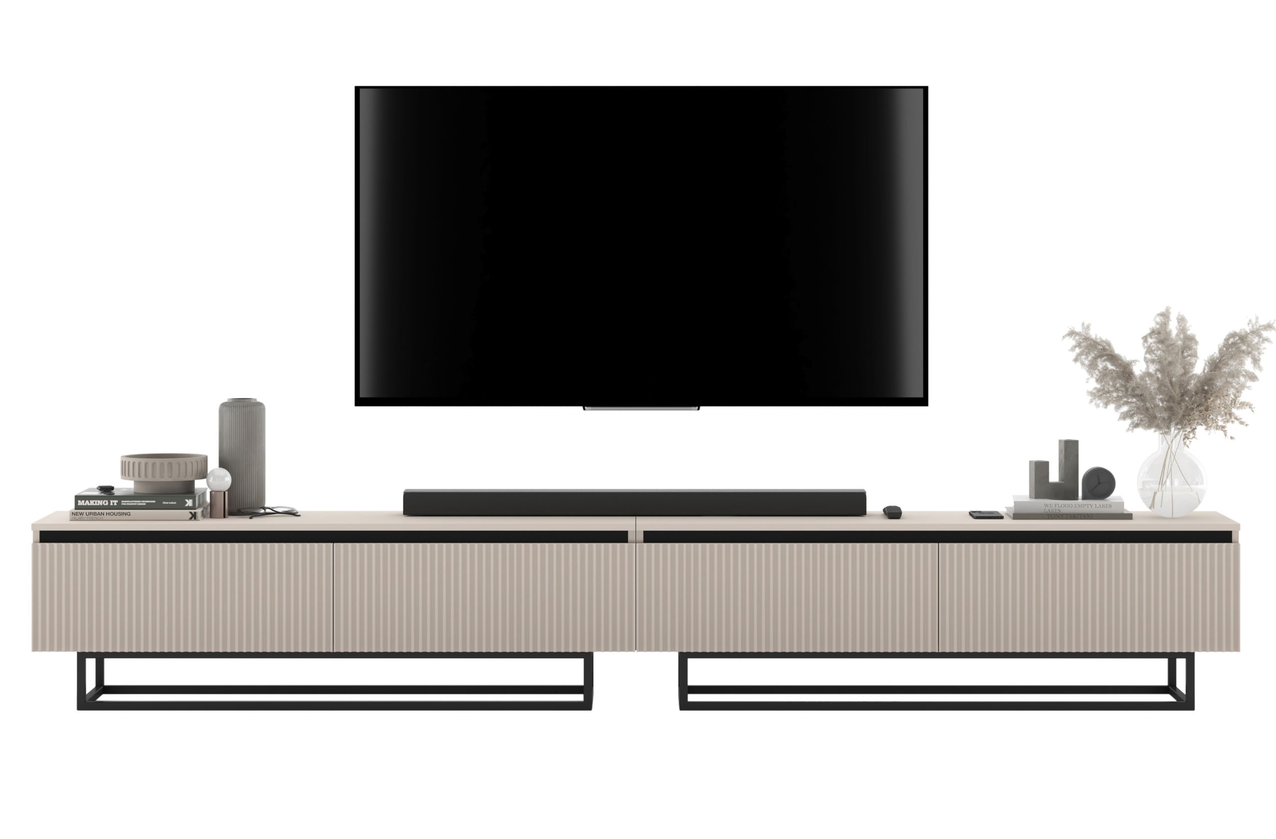 Zestaw dwóch nowoczesnych szafek RTV tworzących spójną i stylową całość. Razem oferują cztery przestronne, zamykane komory, zapewniając dużą pojemność oraz wysoką funkcjonalność. Szafki zostały ustawione obok siebie, tworząc długi, efektowny mebel, który doskonale prezentuje się w nowoczesnych wnętrzach. Całość osadzona jest na metalowych ramach, co nadaje konstrukcji lekkości i nowoczesnego charakteru, jednocześnie zapewniając stabilność i trwałość. Dzięki uchylnym drzwiczkom z blokadą opadania zapewniają łatwy i bezpieczny dostęp do wnętrza. System „push to open” eliminuje potrzebę stosowania uchwytów, podkreślając estetyczny i minimalistyczny charakter mebla. Charakterystyczne ryflowane fronty w połączeniu z czarnymi akcentami wyróżniają ten zestaw na tle innych szafek RTV, nadając mu luksusowego i nowoczesnego wyglądu. SELENE to idealny wybór dla osób ceniących elegancję, funkcjonalność oraz nowoczesne rozwiązania w aranżacji wnętrz.