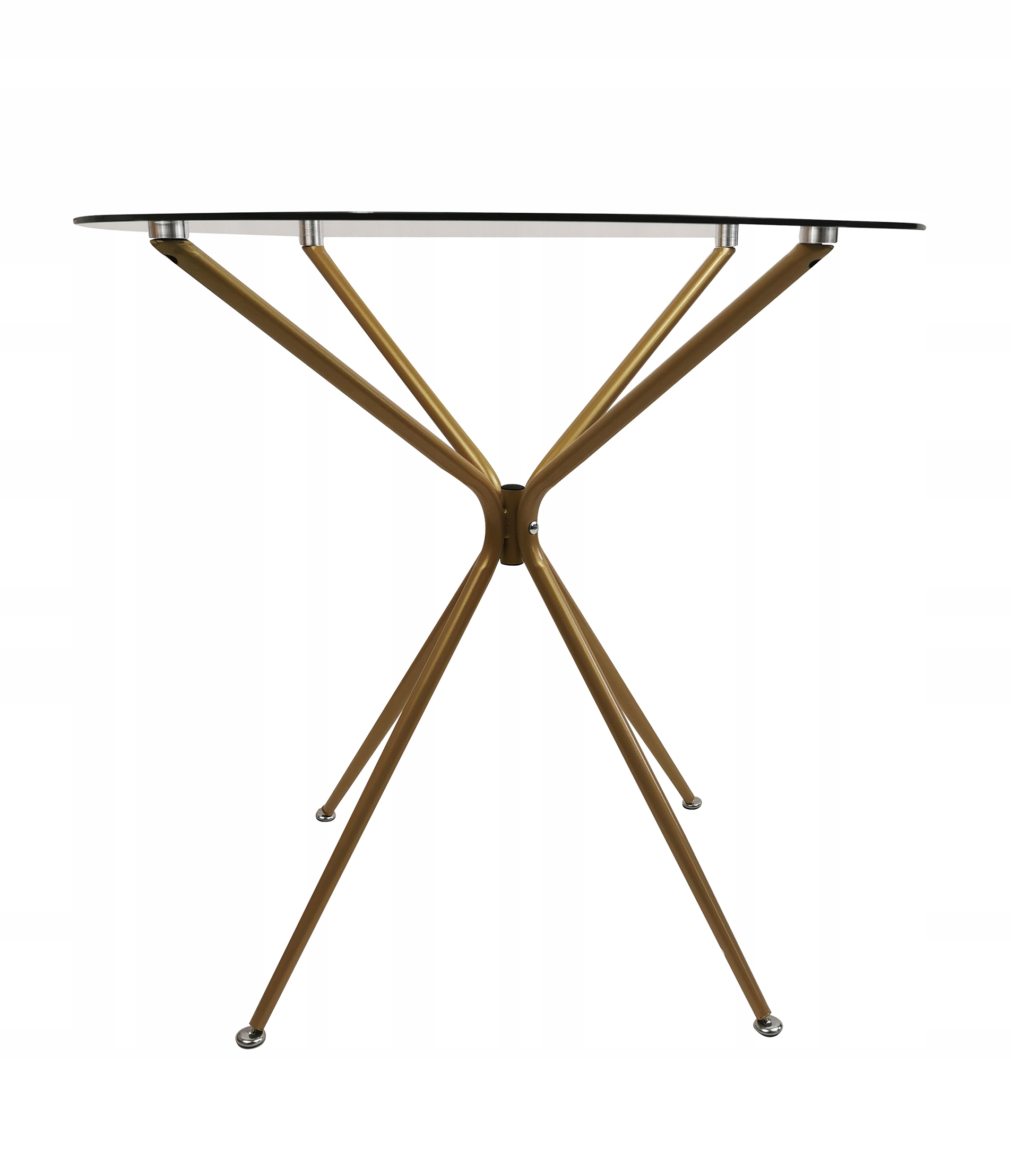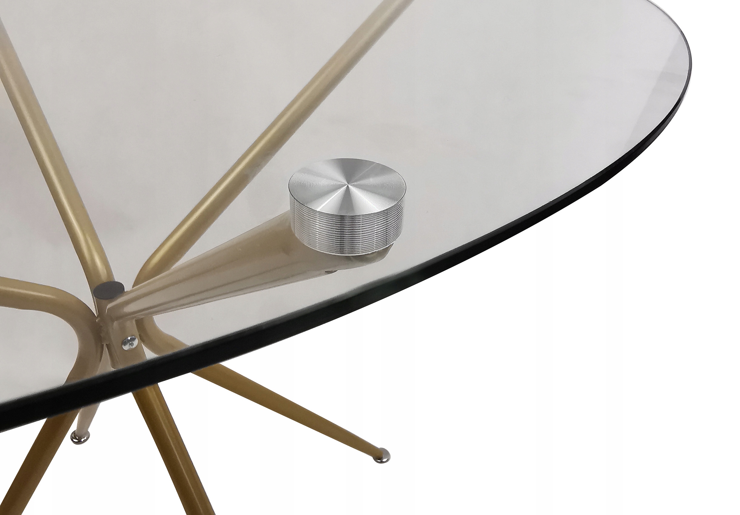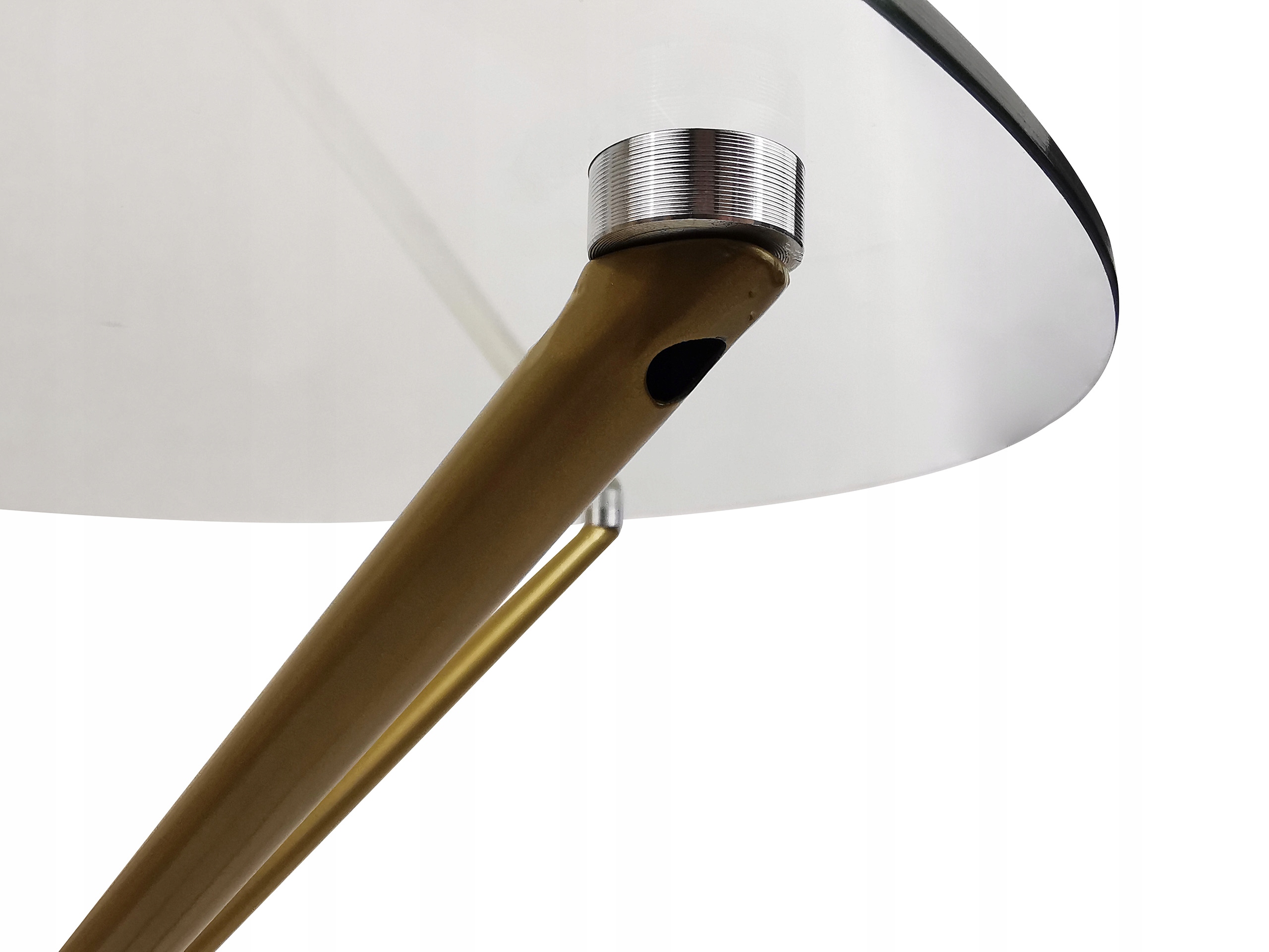 - Blat stolika ma okrągły kształt i został wykonany z przezroczystego szkła, połączony ze złotym korpusem, tworzy interesujący wygląd, który doskonale wpisuje się w styl loftowy lub glamour.
