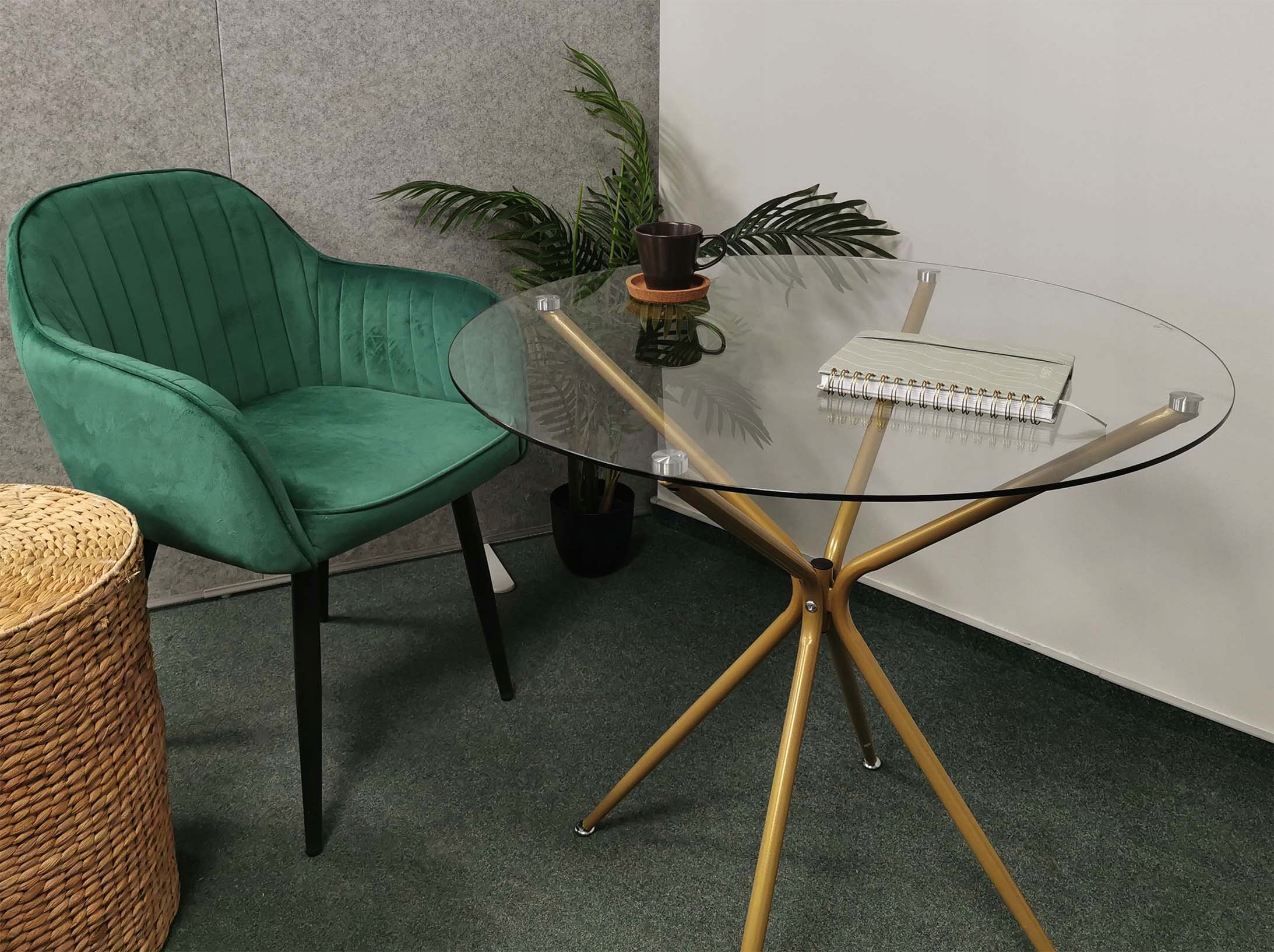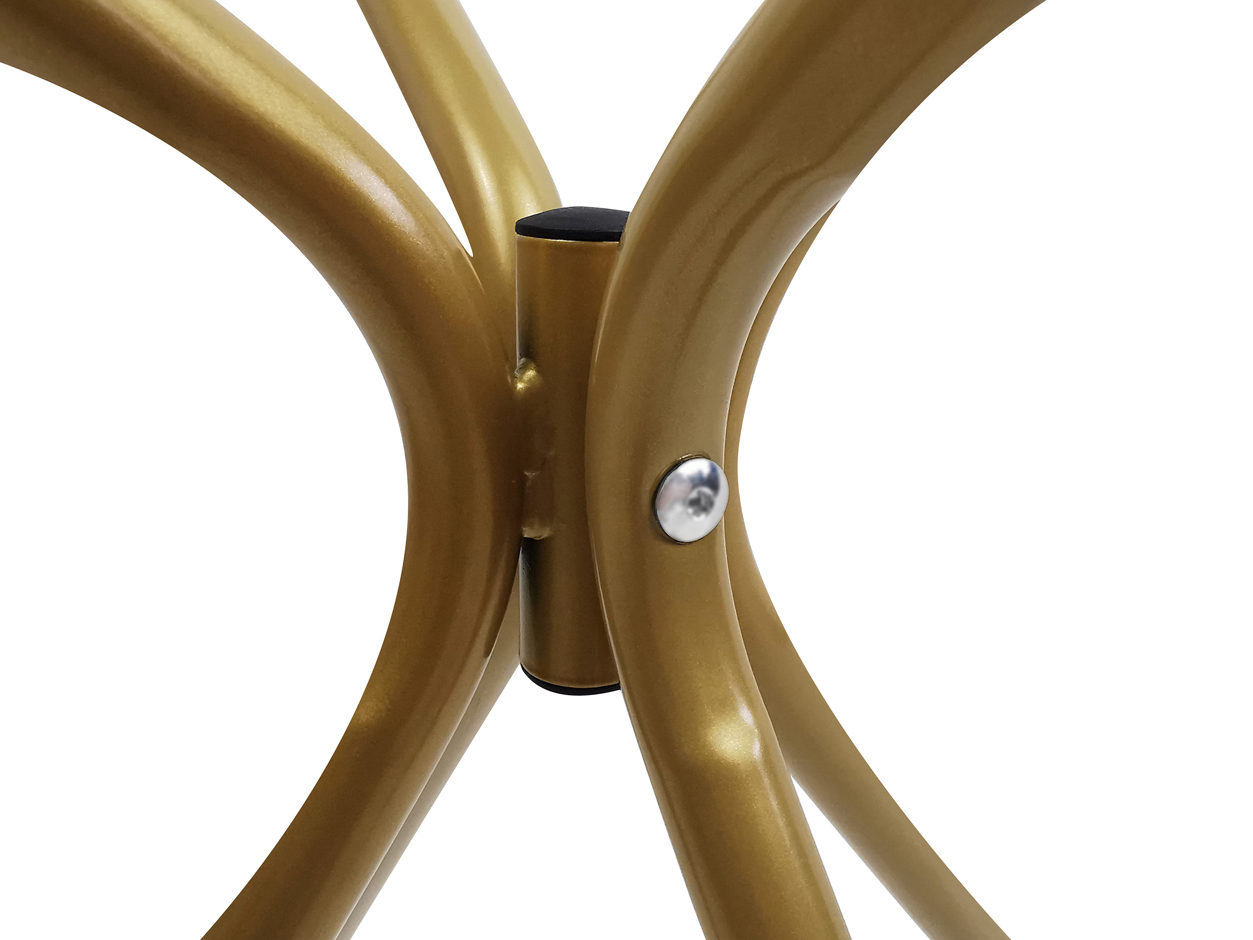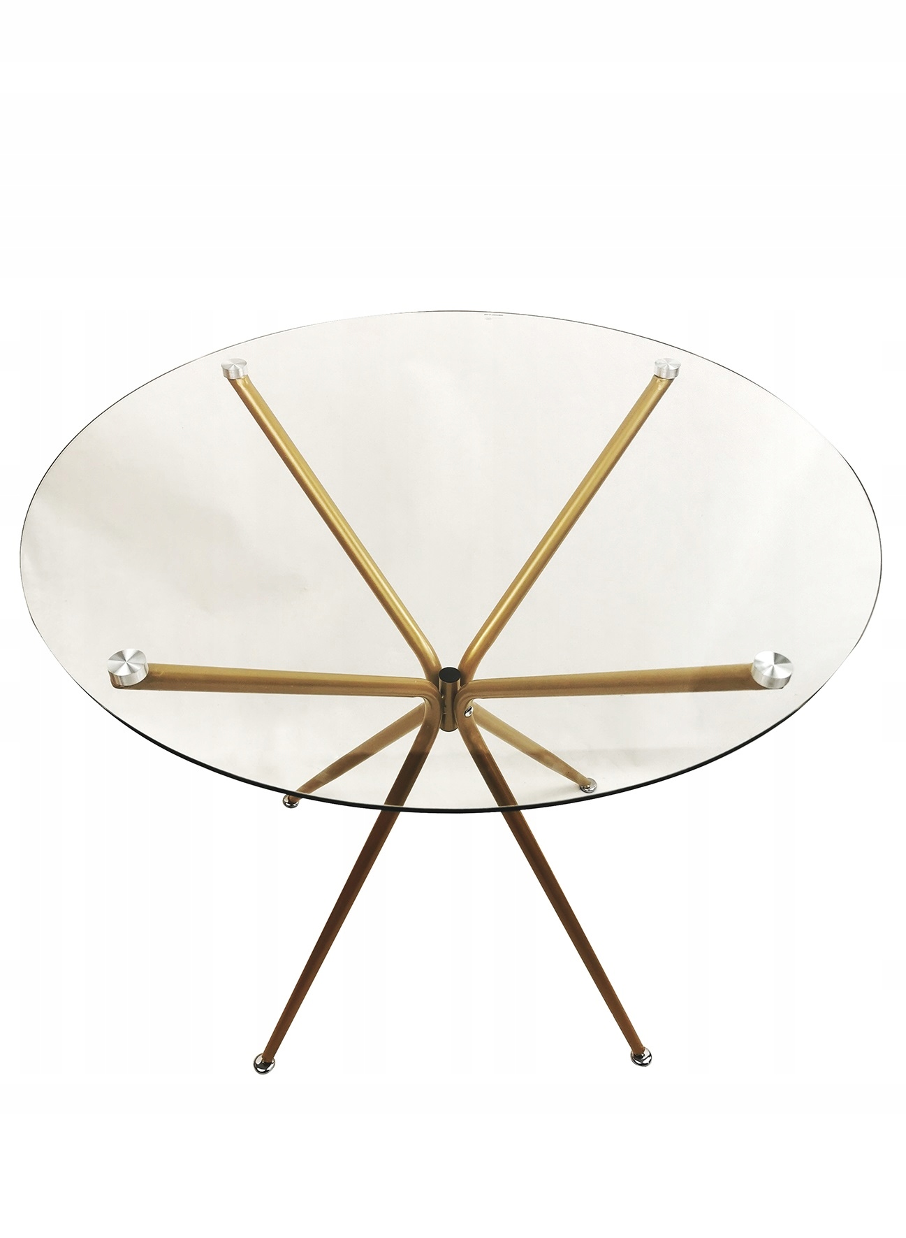 - Blat stolika ma okrągły kształt i został wykonany z przezroczystego szkła, połączony ze złotym korpusem, tworzy interesujący wygląd, który doskonale wpisuje się w styl loftowy lub glamour.
