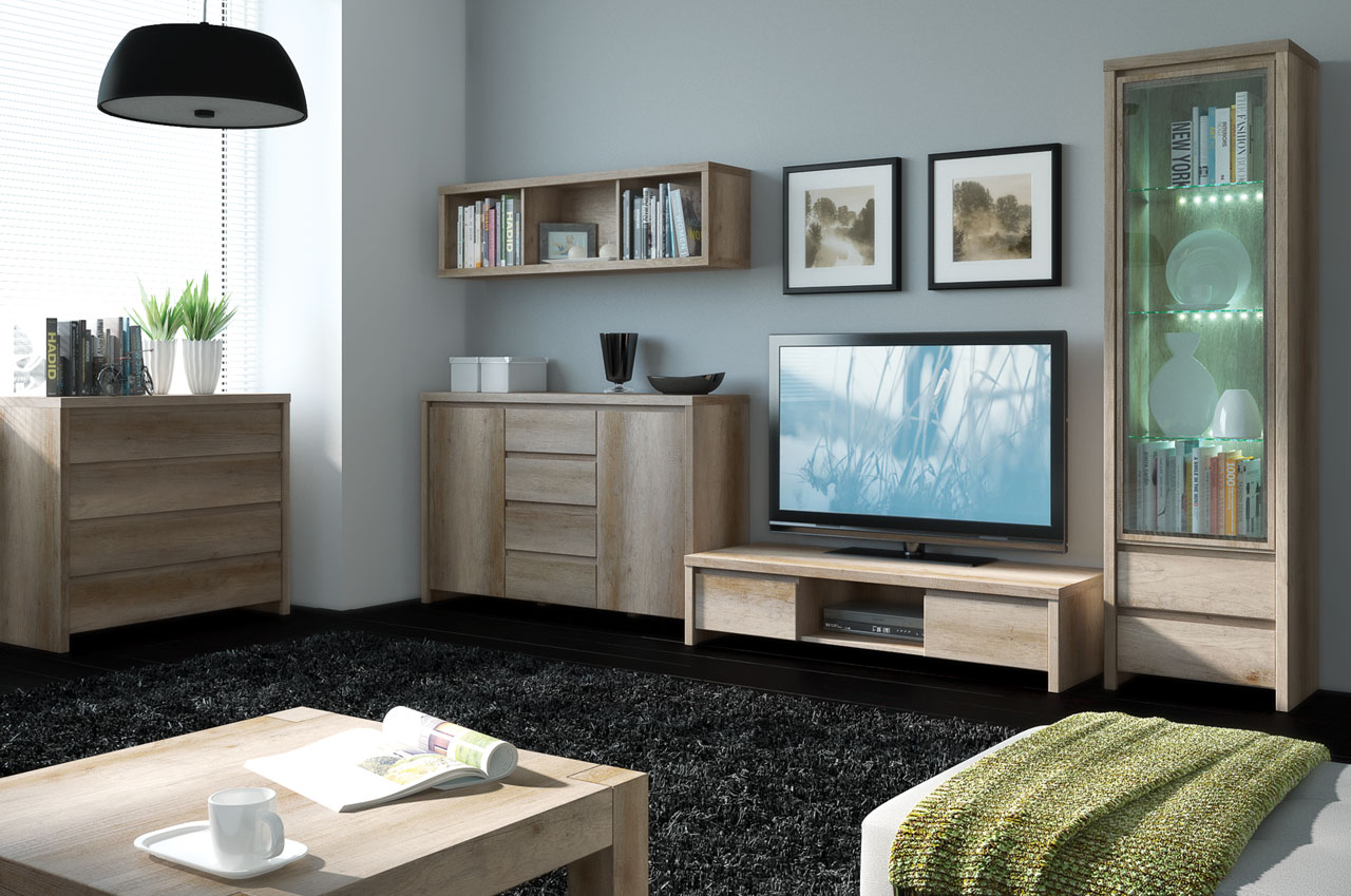 System modułowy Kaspian w nowym wybarwieniu dąb monument o wyraźnym deseniu nadaje wnętrzu harmonii i nowoczesnego stylu. Jasna kolorystyka sprawi, że wystrój pokoju będzie pogodny i przytulny.