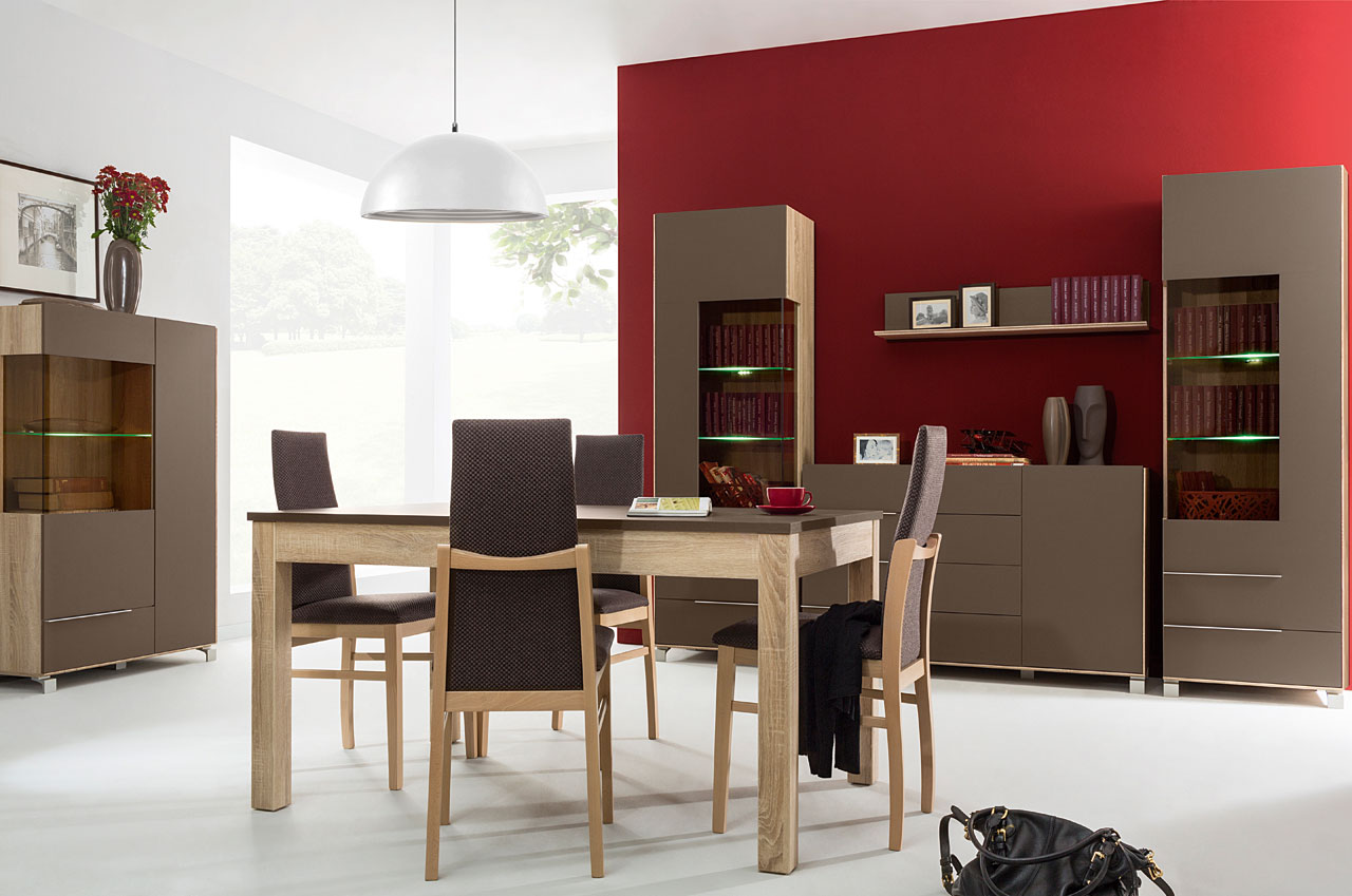 Uzupełnieniem kolekcji jest rozkładany stół o geometrycznych kształtach i stylistycznie korespondujące z nim krzesła z tapicerowanym siedziskiem i oparciem. Taki zestaw świetnie sprawdzi się w dużym pokoju lub jadalni.