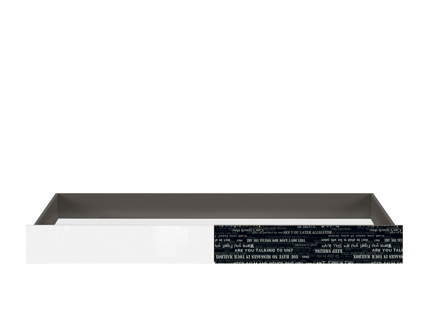 Kilka wersji kolorystycznych mebli Graphic to więcej możliwości na aranżację wnętrza, które doskonale podkreśli jego indywidualizm. Barwę frontów można wybrać spośród kilku modnych opcji – szary wolfram, popiel, biały lustrzany połysk, żółty oraz biały. Jeśli lubisz oryginalne rozwiązania możesz, również wybrać fronty pokryte specjalną folią z napisami lub czerwonymi akcentami. Wygląd wybranych szafek urozmaicają pomysłowe, dwustronne listwy, które można dowolnie odwracać i bawić się wyglądem własnych mebli.