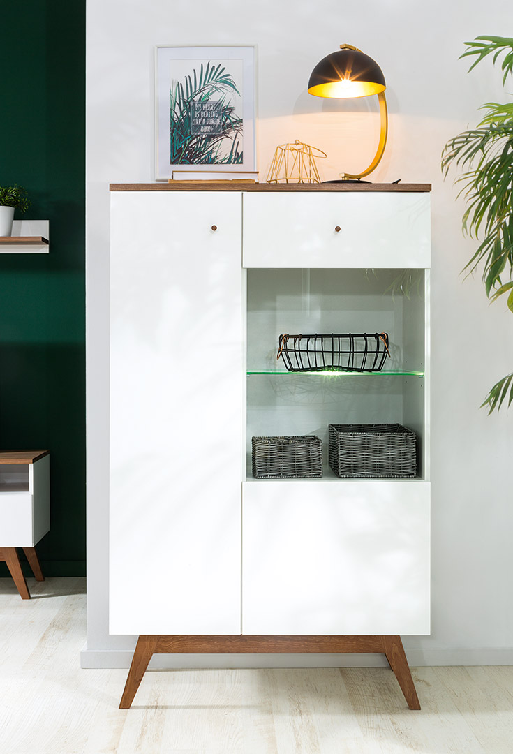 Heda to kompozycja zróżnicowanych modułów o unikatowym designie. Wyrazistym akcentem mebli jest drewniany stelaż, który zgrabnie unosi meble ponad poziom podłogi. Smukłe nóżki dodają meblom lekkości, dzięki czemu komody, regały czy wysokie witryny dobrze sprawdzą się nie tylko w przestronnych pokojach dziennych, ale również niewielkich pomieszczeniach. Kolorystycznie spójne blaty mebli i niewielkie punktowe uchwyty dają wyrazisty kontrast dla utrzymanych w kolorach lśniącej bieli frontów.