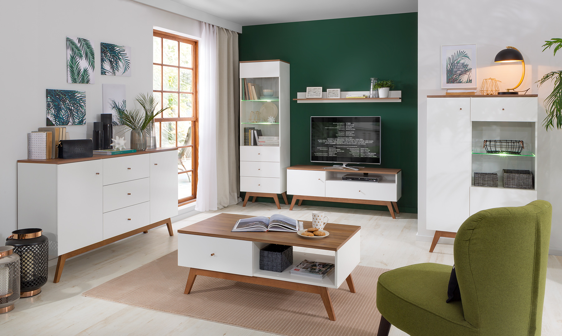 Dzięki różnorodnym modułom kolekcja Heda daje możliwość stworzenia unikalnej aranżacji każdej przestrzeni. W salonie idealnie swoją rolę spełni szafka RTV dostępna w dwóch wariantach do wyboru – z praktyczną szufladą lub szufladą i dodatkową zamykaną szafką. W przechowywaniu drobiazgów pomogą pojemne komody i witryny wyposażone w eleganckie szklane półki i energooszczędne oświetlenie LED, a także pakowna dwudrzwiowa szafa. System Heda dobrze sprawdzi się też w domowym gabinecie. Stylowe biurko na wysokich drewnianych nogach stworzy miejsce do nauki i pracy.