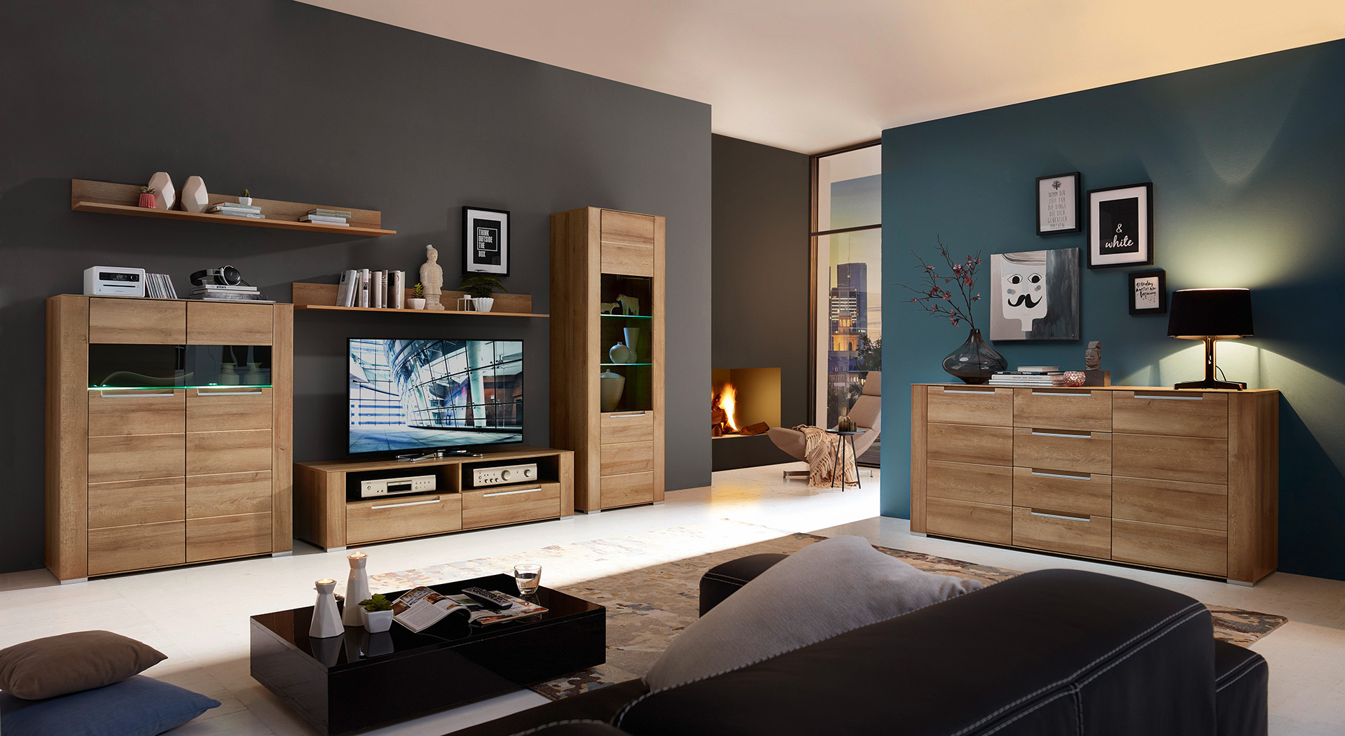 Kolekcja, która bazuje na pięknej naturalnej barwie drewna zyskuje nowoczesnego sznytu, dzięki srebrnym zintegrowanym uchwytom, które nie tylko zdobią, ale zapewniają też wygodny dostęp do wnętrza szafek i szuflad. Oświetlenie LED-owe nastrojowo podświetlają ciemne wnętrza witryn. Dzięki przeszkleniom ustawione w witrynach dodatki prezentują się niezwykle efektownie, zwłaszcza wieczorem, gdy delikatne światła nadają wnętrzu głębi.