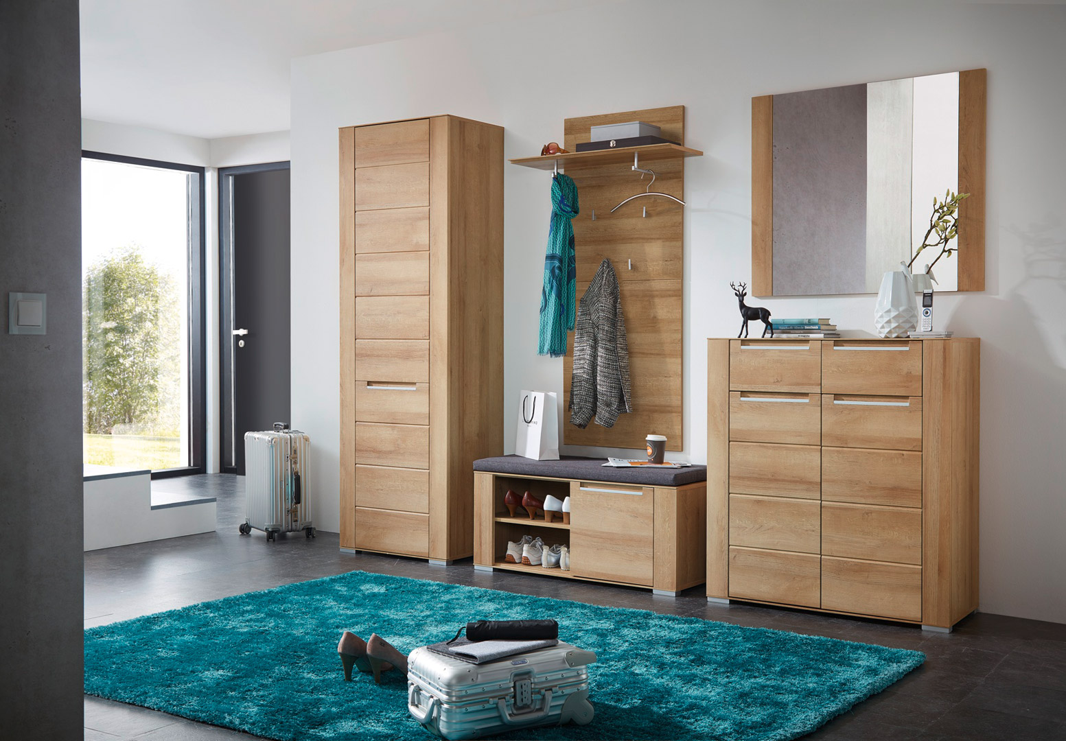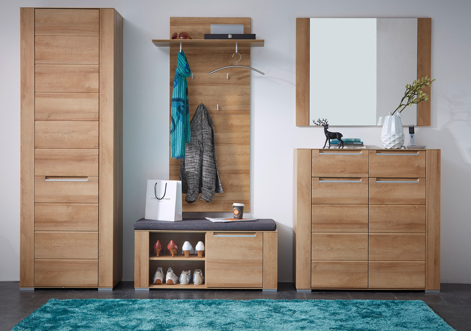 Poszczególne elementy kolekcji idealnie prezentują się solo, jak i w duecie. Dzięki uniwersalnym modułom można z łatwością tworzyć indywidualne zestawy lub zdecydować się na gotowe komplety w postaci meblościanek. Wśród dostępnych elementów znajdziemy pojemne komody, regały i szafki, a także idealne do przedpokoju panele z wieszakami czy lustra.