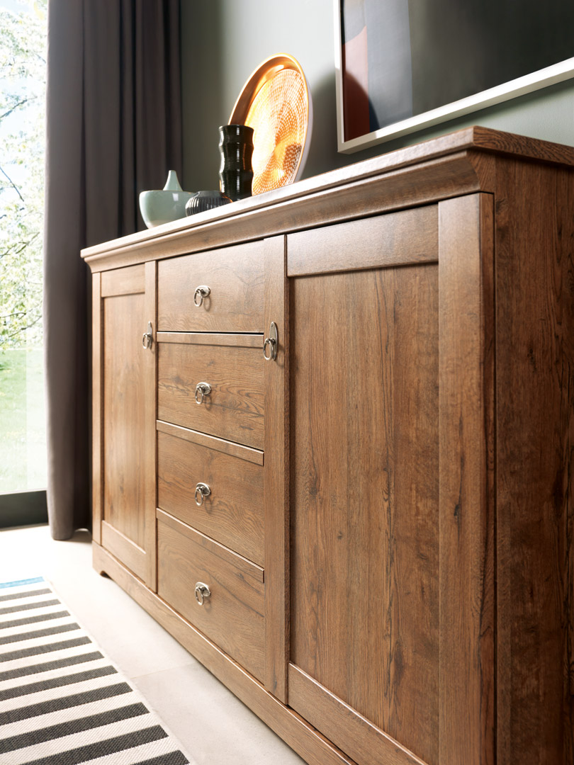 Patras to wyjątkowy system, który będzie zdobił wnętrza eleganckich pokoi dziennych. Gustowny w swej prostocie, przyciąga uwagę głęboką kolorystyką i wyrazistym rysunkiem słojów i rysunku drewna w okleinie dąb april. Fronty szafek urozmaicone są o klasyczne ramiaki, które dodają tej kolekcji wyjątkowego charakteru. Kropką nad „i” w stylistyce tego systemu są idealnie dobrane uchwyty – delikatne, w kolorze srebra, dające powiew świeżości i luksusu. Dzięki swojej prostocie, neutralne meble nie konkurują z wnętrzem i pozwalają brylować kolorom, dając duże pole do popisu przy wyborze dodatków i dekoracji.