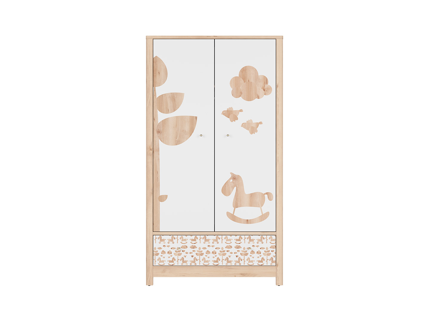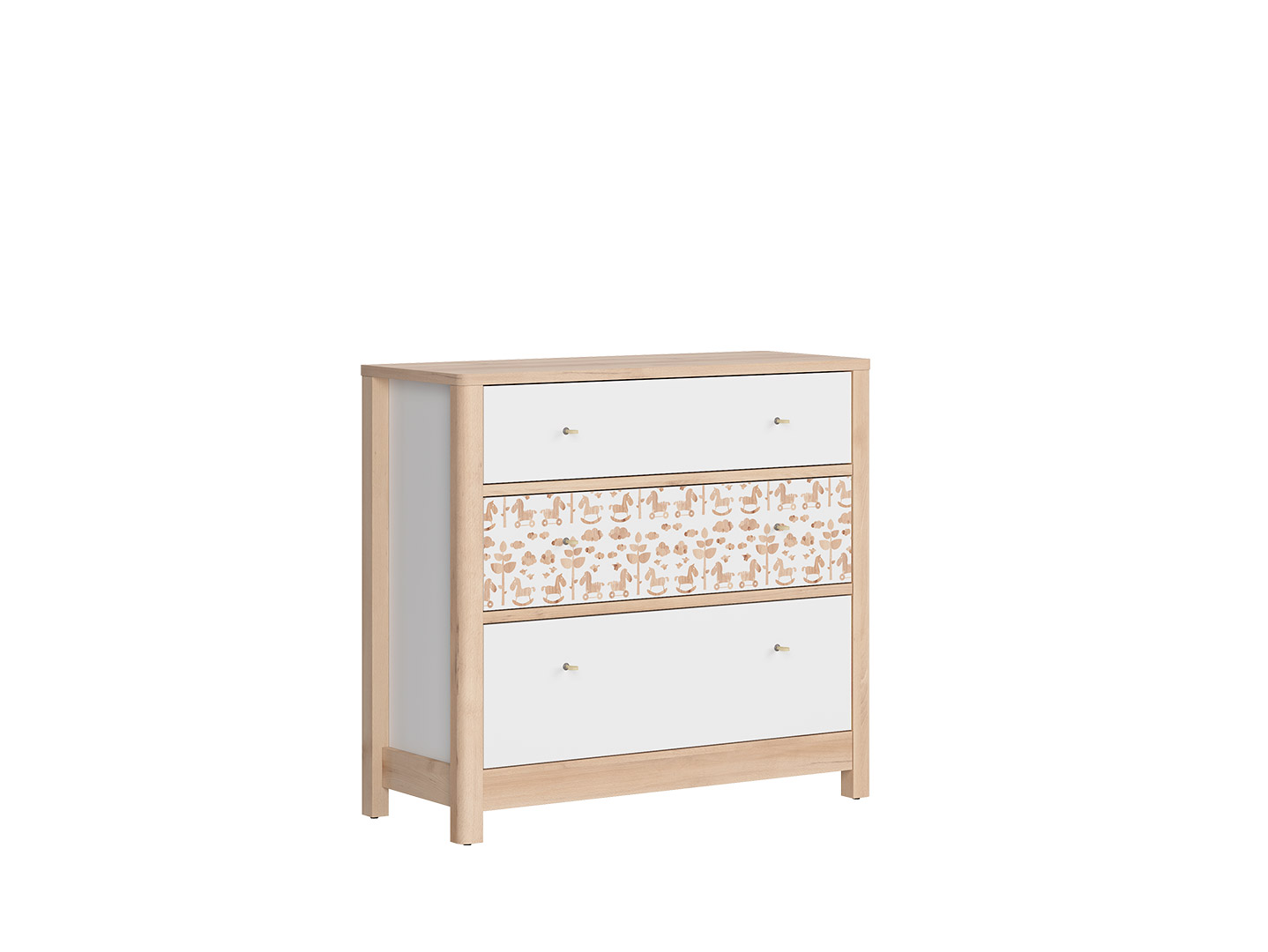 Ciekawa stylistyka kolekcji Timon sprawi, że wnętrze poruszy wyobraźnię najmłodszych. Meble w kolorze bieli pokryte oryginalną okleiną we wzorki w dekorze drewna (konie na biegunach, chmurki, liście, ptaki) będą doskonale pasować zarówno do pokoju dziewczynki, jak i chłopca. Oprócz cyfrowych nadruków meble Timon mają jeszcze jeden ciekawy stylistyczny akcent – skórzane uchwyty w formie poręcznej pętelki.