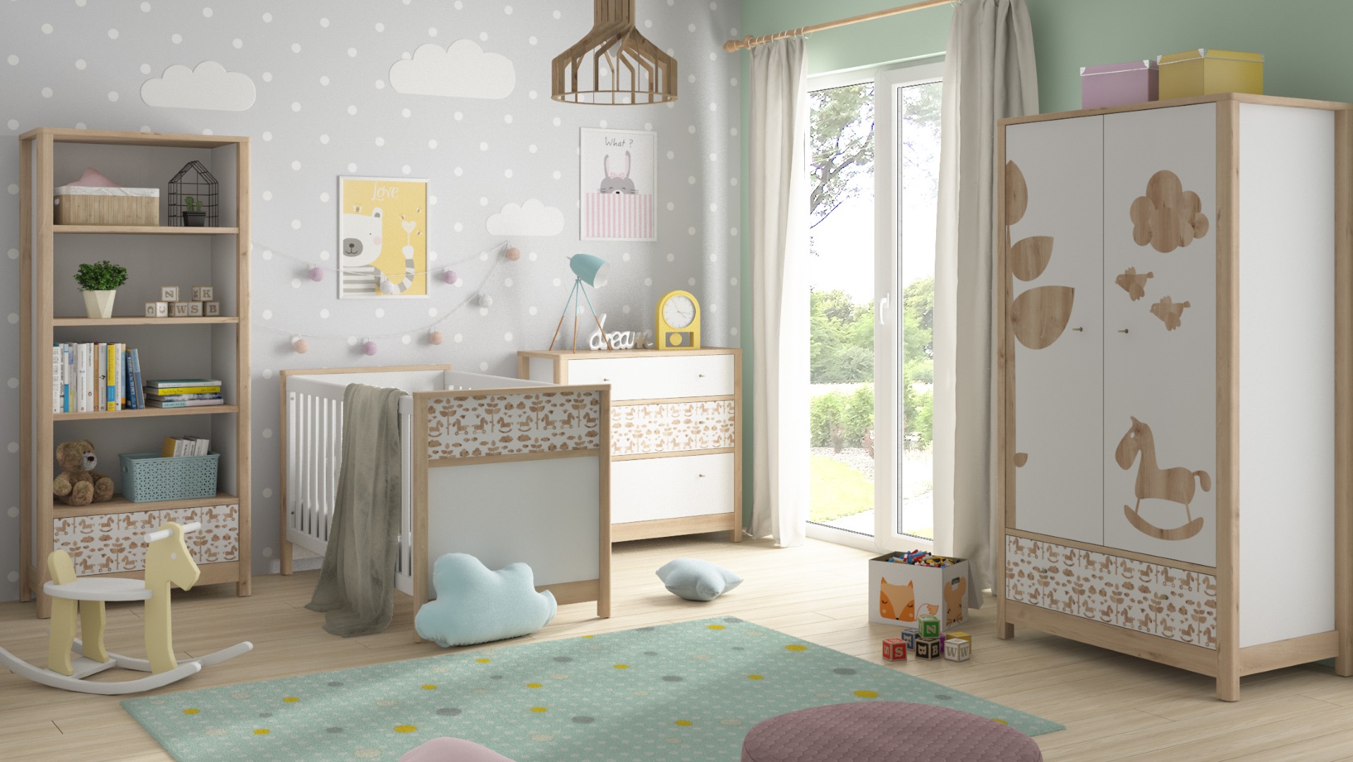 Modułowe meble stwarzają wiele możliwości aranżacyjnych. Kolekcję można rozbudowywać o nowe elementy, zwiększając funkcjonalność wnętrza i ilość miejsca niezbędną do przechowywania. W jej skład wchodzą dwudrzwiowa szafa z szufladą, wysoki regał, pakowna komoda z trzema szufladami i łóżeczko. Kolekcja nie posiada ostrych krawędzi, w trosce o bezpieczeństwo najmłodszych wszystkie boki zostały zaokrąglone.