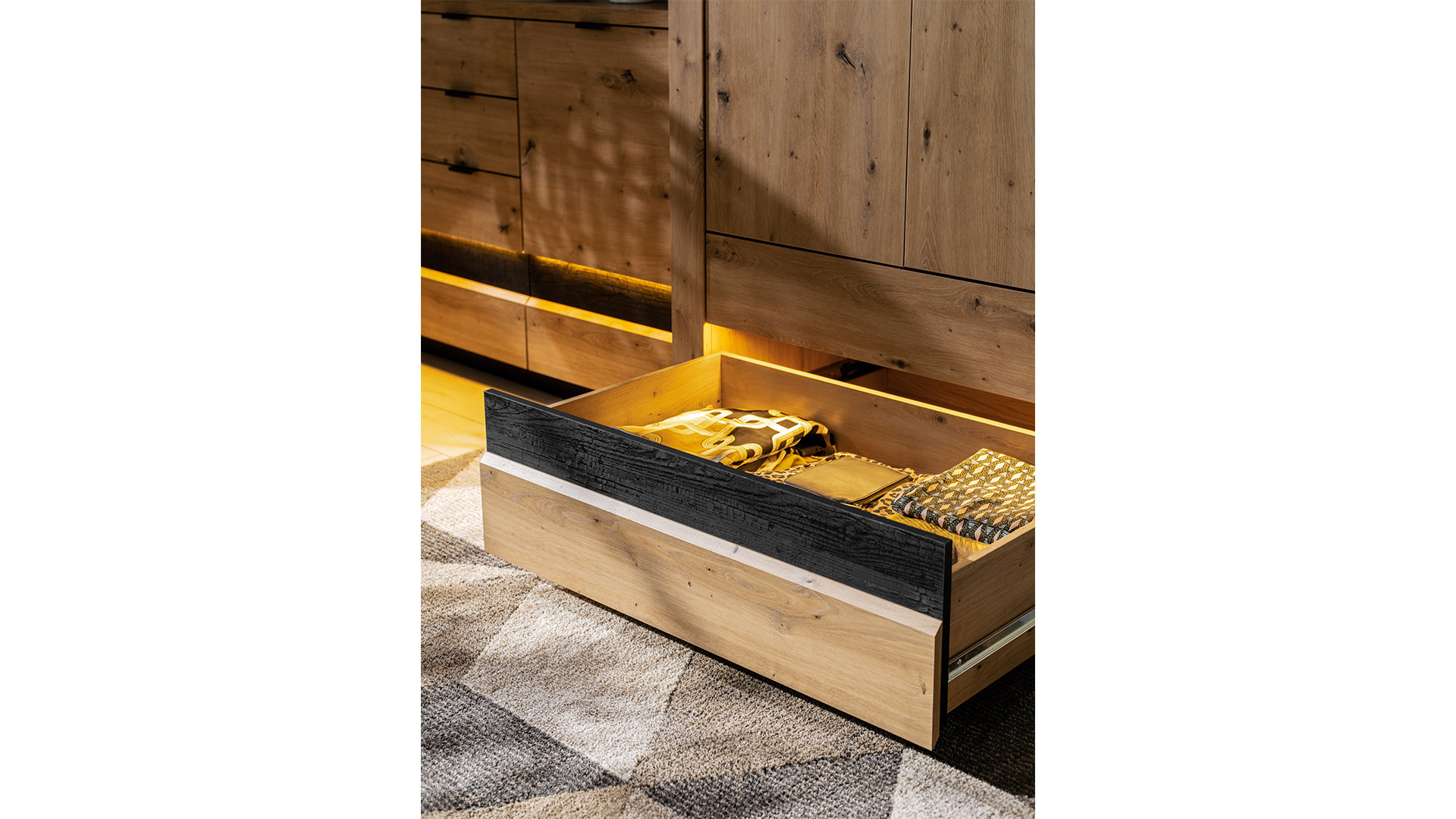 Bryłę osadzono na solidnej czarnej podstawie, z którą koresponduje efektowna ciemna listwa dekoracyjna w kolorze spalonej deski. Subtelne oświetlenie LED oświetla dekor i dodaje blasku całej linii.