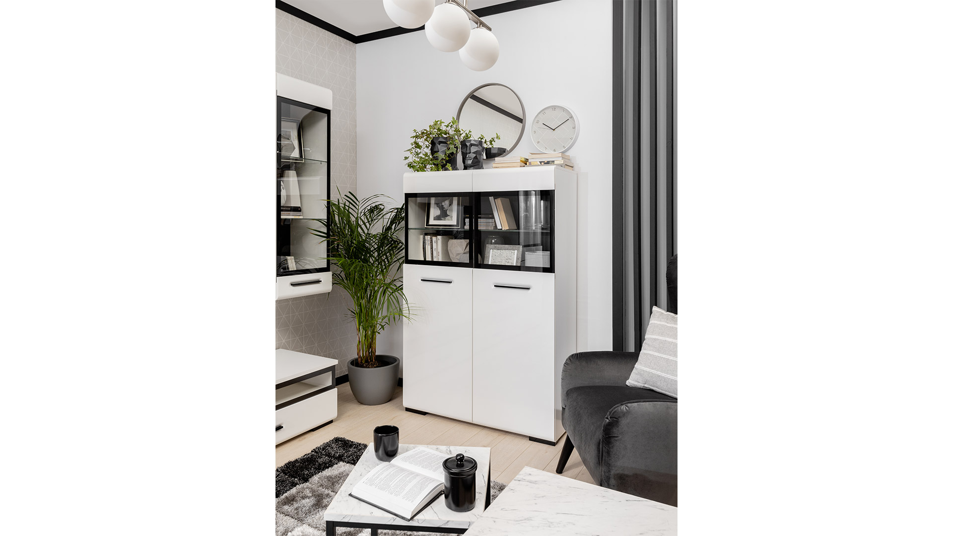 Chcąc opisać kolekcję jednym zdaniem, trzeba byłoby odwołać się do jej elegancji, prostoty i blasku, jaki wprowadza do aranżacji. Inspirowana postępowym, holenderskim miasteczkiem w północno-wschodniej części kraju, udowadnia, że styl nowoczesny nadal ma wielu miłośników. Jeżeli lubisz eleganckie połączenie czerni i bieli, to jest to linia stworzona dla Ciebie. Gładkie fronty w kolorze biały połysk towarzyszą biały korpusom. Natomiast czerń pojawia się jako akcent – rama wokół witryn. To właśnie za przeszkleniem skrzą się subtelne lampki LED, które podkreślą zawartość mebla. Może rodzinne zdjęcia, rodową zastawę, a może wazon przywieziony z ostatniej podróży?