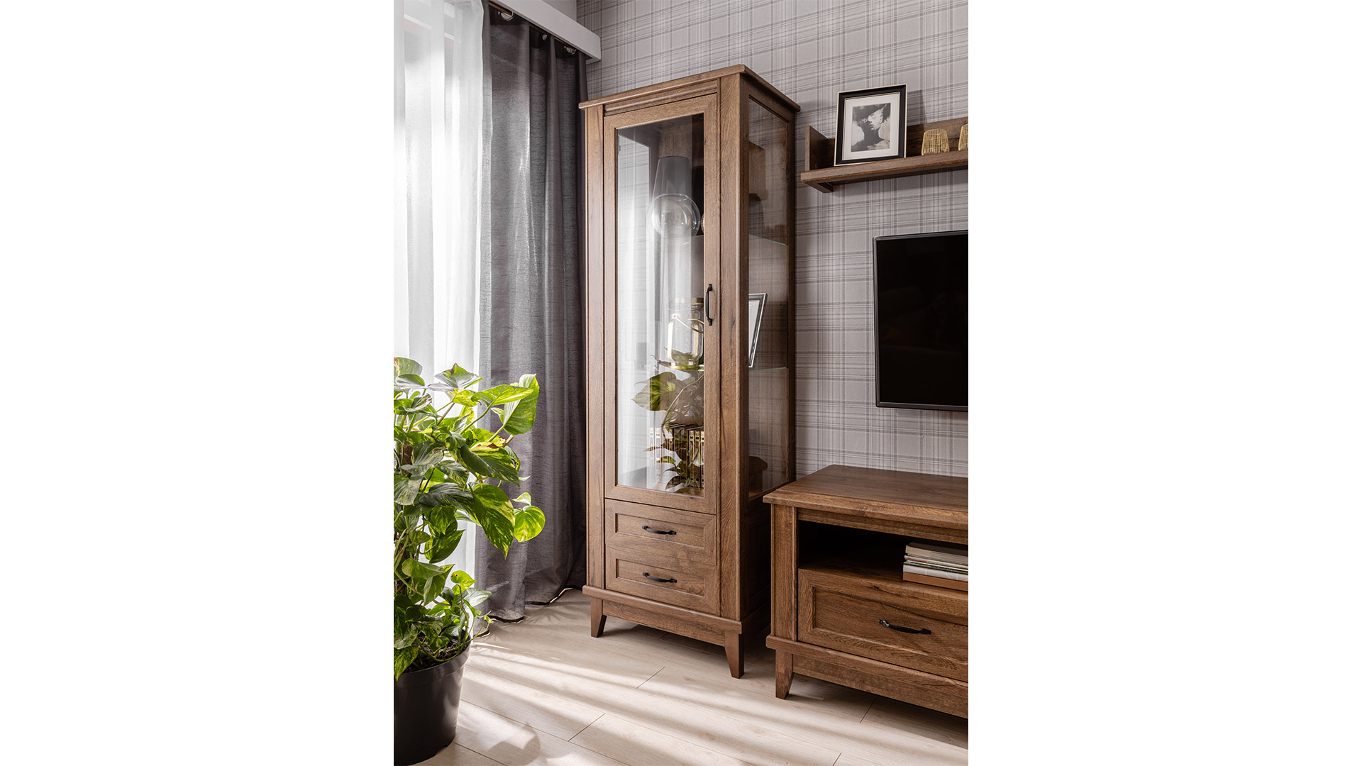 Można pokochać kolekcję Reno od pierwszego wejrzenia. Za jej witryny, w których ścianki boczne również są szklane, przez co ekspozycja będzie jeszcze lepiej widoczna. Możesz doświetlić ją LED (w opcji), przez co stworzysz w salonie wyjątkowy klimat. To wszystko opakowano w ciemne, ciepłe wybarwienie dąb april.