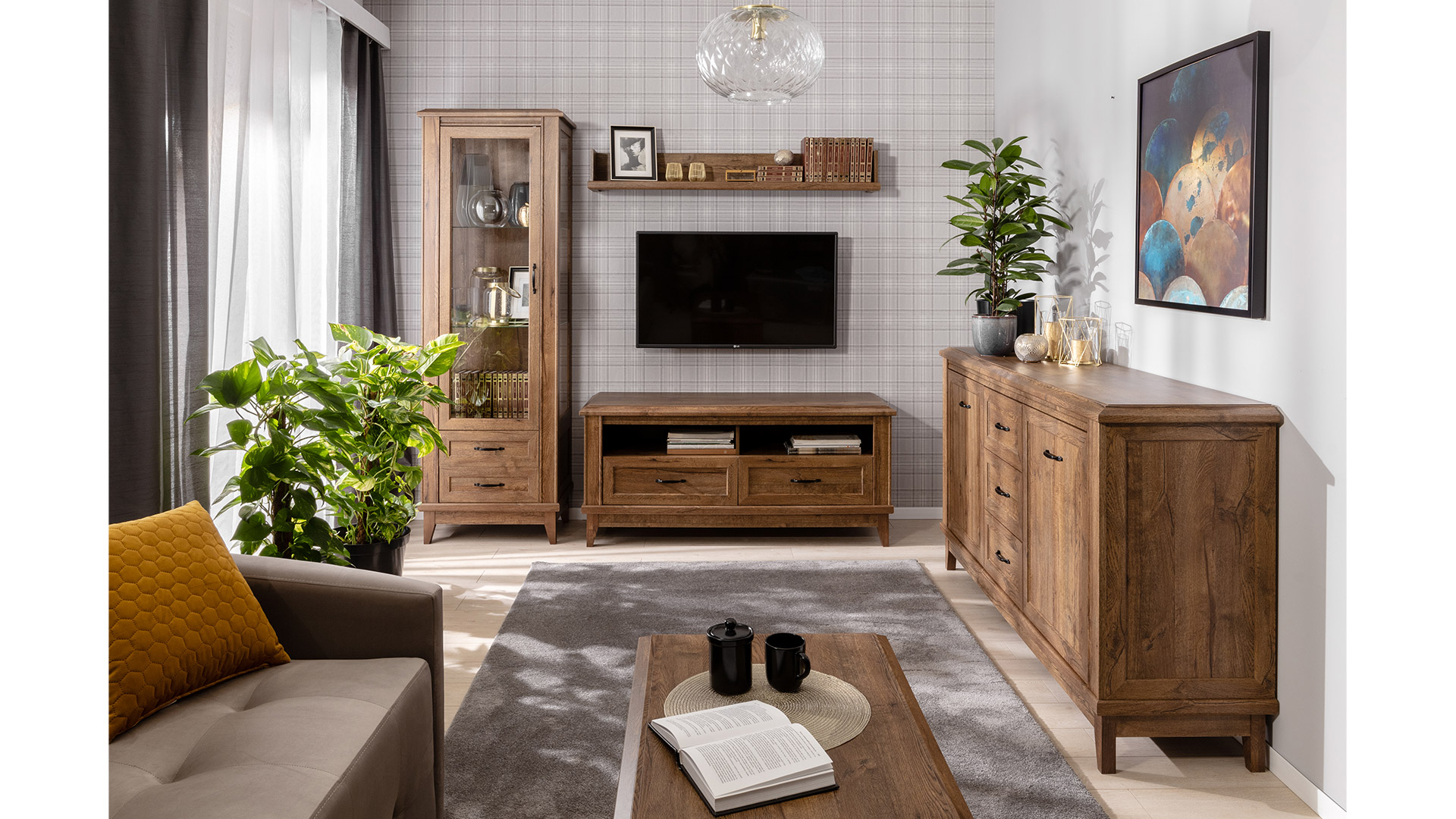 W kolekcji Reno znajdziesz pojemną szafę, wysoką witrynę typu słupek, szeroką witrynę z szafkami i szufladami, dwa typy komody, szafkę RTV, półkę i ławę.