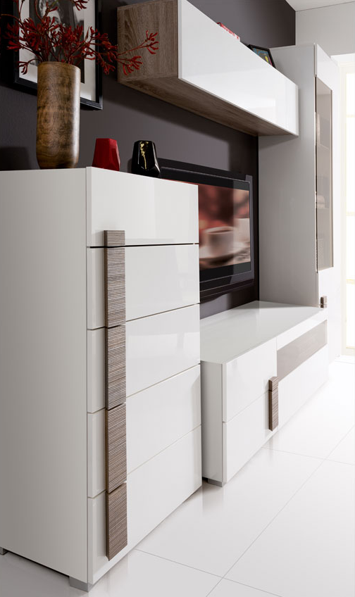 Prosta, lekka sylwetka oraz uniwersalne zestawienie kolorów – nieskazitelnej bieli i chłodnych brązów – sprawiają, że meble Domenica są idealną podstawą modernistycznej aranżacji. Niepodważalnym atutem jest również zastosowana technologia. Fronty lakierowane są na wysoki połysk, dzięki czemu ich powierzchnia jest lśniąca, ale również bardziej odporna podczas codziennego użytkowania. Korpusy poszczególnych brył dostępne są w 2 wybarwieniach do wyboru – białym lub dębie sonoma ciemnym. Ciekawym akcentem jest ryflowany uchwyt wykonany z litego drewna w kolorze dąb trufla, który łagodzi minimalistyczną, niemal surową formę mebli.