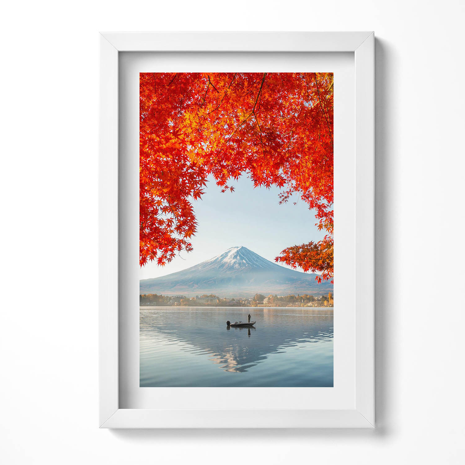 Obraz w ramie MDF - Pejzaż góry Fuji pod czerwonym drzewem - Biała rama - 20x30