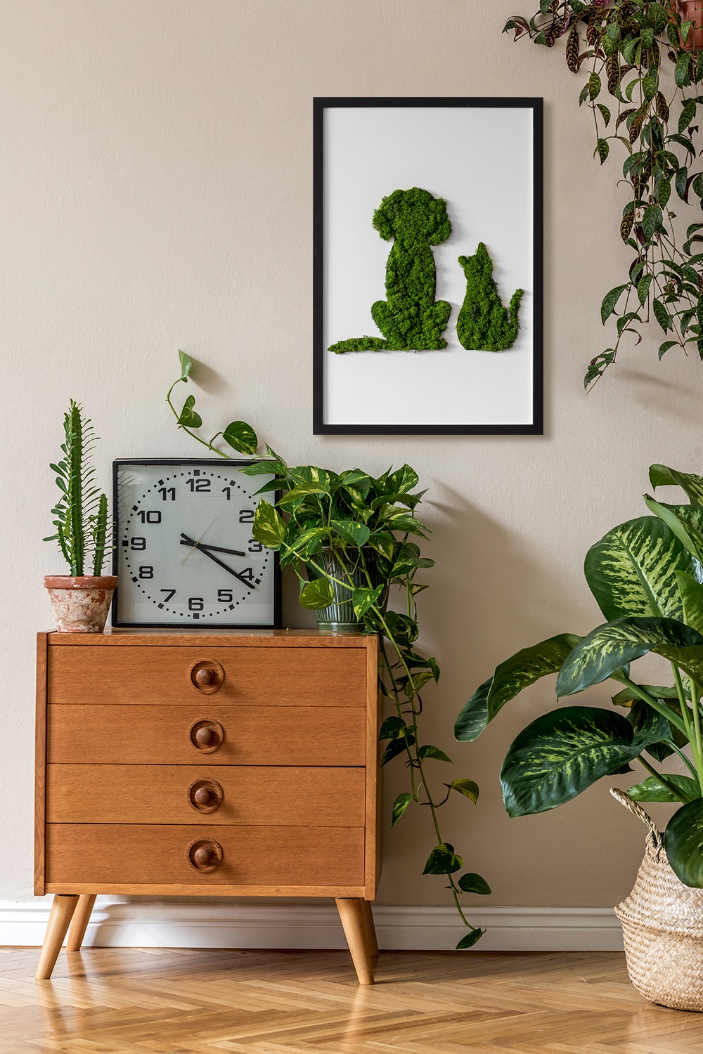 - Chrobotek nie potrzebuje słońca. Obraz można powiesić w pomieszczeniu bez dostępu do okien.