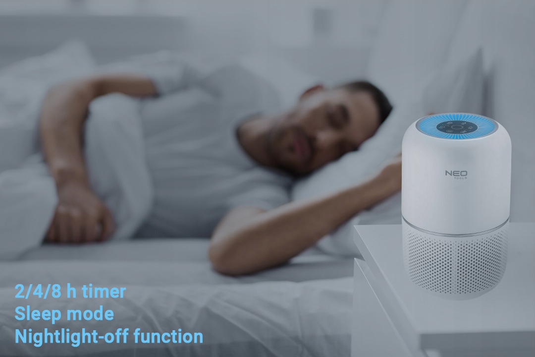 Oczyszczacz powietrza z 3 stopniowym systemem filtracji, funkcją lampki nocnej i timera.
