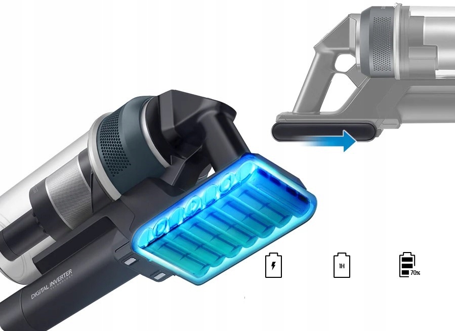 Długi czas odkurzania bez ladowania, dopasowany do indywidualnych potrzeb. Pojemny akumulator zapewnia nawet 60 minut odkurzania. Po upływie tego czasu można wymienić baterię na zapasową, by wydłużyć czas odkurzania aż do 120 minut. Unikalna technologia Samsung gwarantuje również, że akumulator zachowuje 70% swojej pierwotnej pojemności przez nawet 500 cykli ładowania.